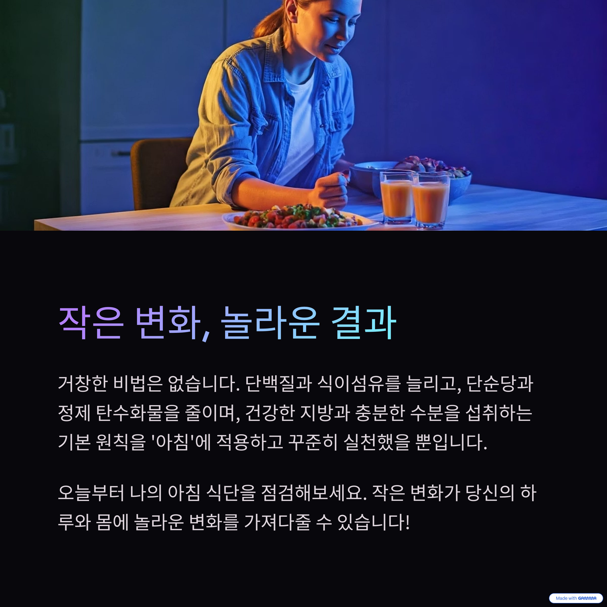 혹시 지금 다이어트로 고민하고 계신다면, 오늘부터 나의 아침 식단을 한번 점검해보는 것은 어떨까요? 작은 변화가 당신의 하루, 그리고 당신의 몸에 놀라운 변화를 가져다줄지도 모릅니다!