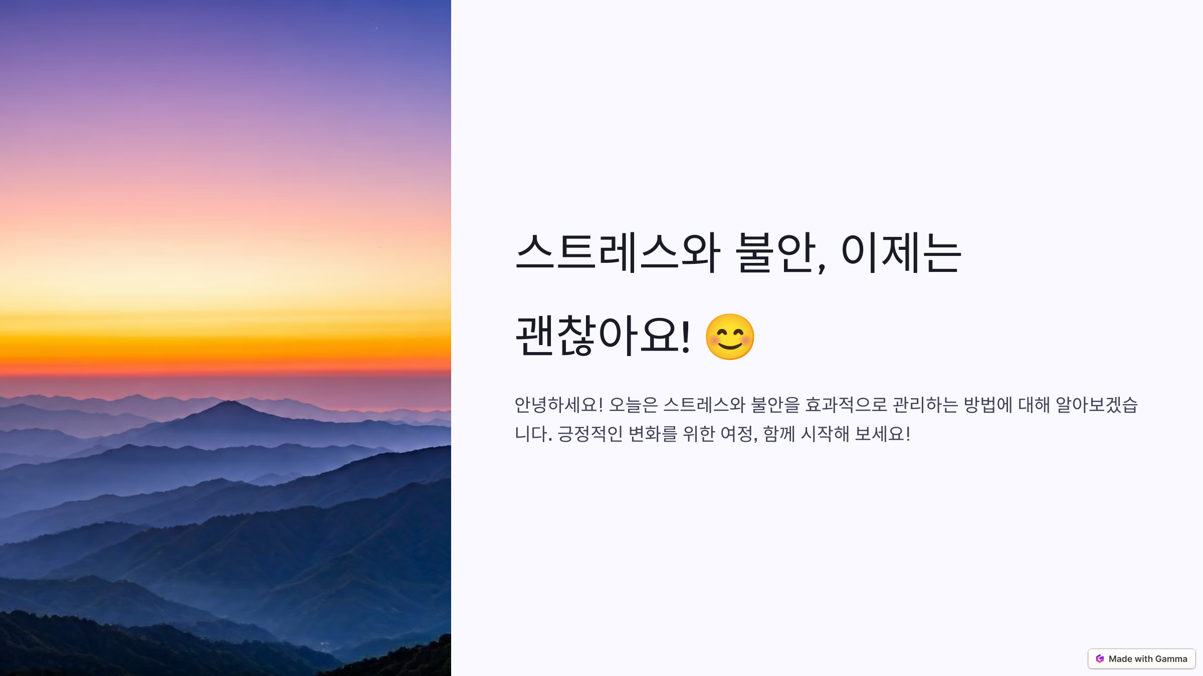 • Tip: 감정을 느낄 때, 머릿속으로 혹은 말로 자신의 감정을 묘사해보세요. 예를 들어, "나는 지금 업무가 너무 많아서 압박감과 불안감을 느끼고 있구나." 처럼 구체적인 상황과 감정을 연결하여 표현하는 것이 효과적입니다.