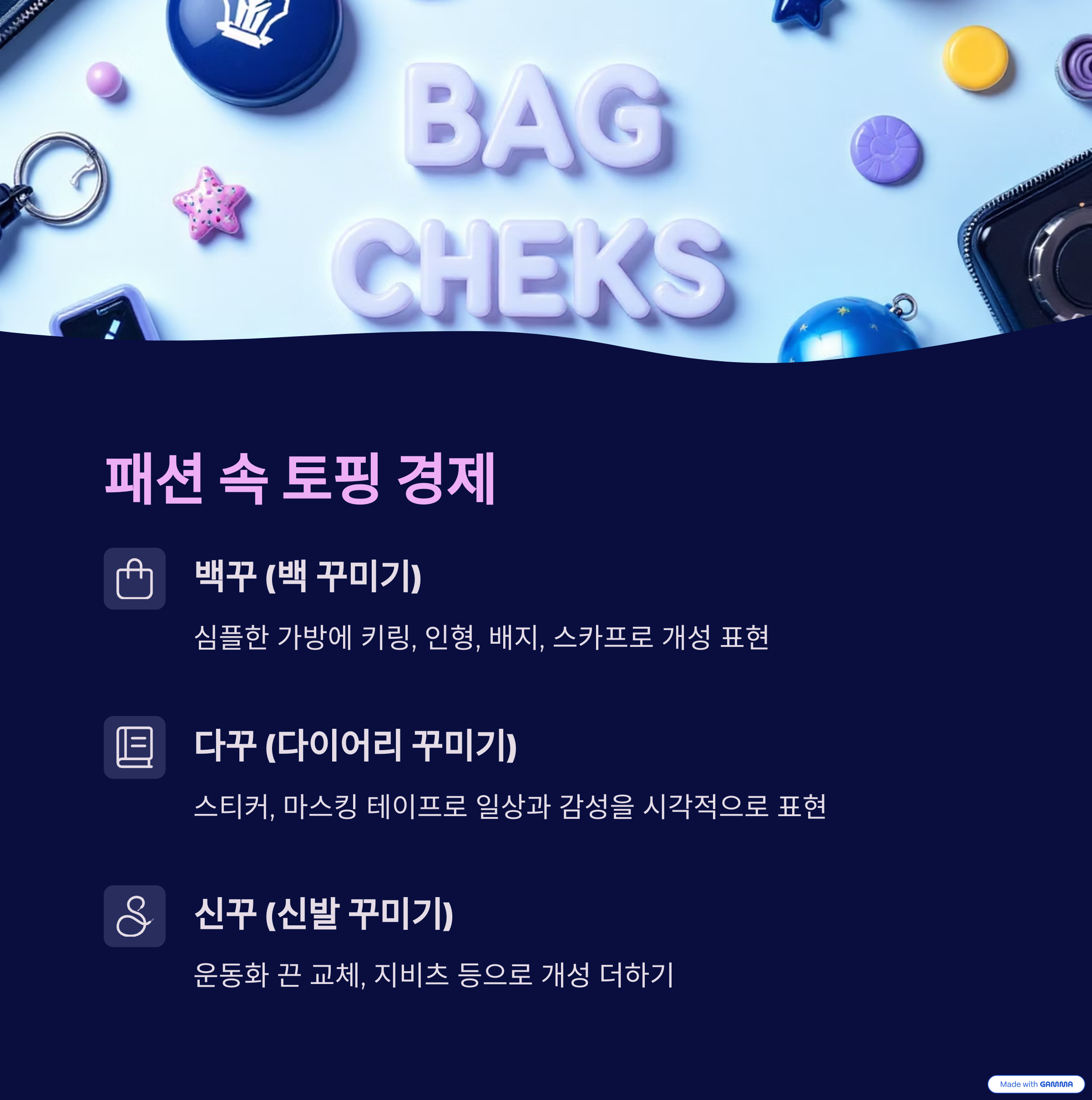 • 신꾸 (신발 꾸미기): 운동화 끈을 바꾸거나, 신발 액세서리 '지비츠' 등을 활용하여 개성을 더하는 것도 대표적인 토핑 경제의 예시입니다.
