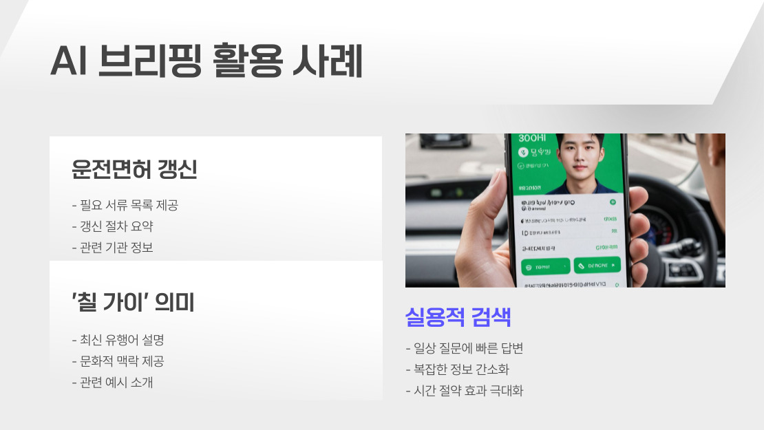 AI 브리핑의 가장 큰 특징은 핵심 정보를 간결하게 요약해준다는 점입니다. 예를 들어, '운전면허 갱신 필요 서류'나 '여권 사진 찍을 때 안경 착용 가능 여부'와 같이 명확한 답변이 필요한 질문에 대해 정부 웹사이트나 공신력 있는 기관의 정보를 바탕으로 정확한 요약 정보를 제공합니다[3][5]. 이를 통해 사용자는 여러 문서를 일일이 확인하는 번거로움을 줄일 수 있습니다. 👍