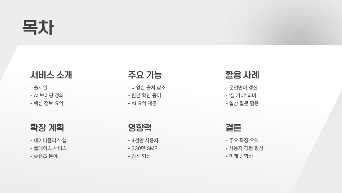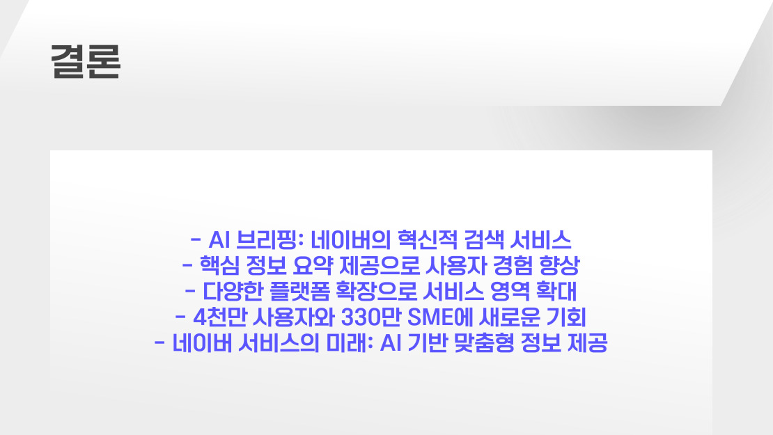- 지속적인 서비스 확대: 네이버는 연내(2025년) AI 브리핑 적용 범위를 검색 외 다양한 서비스로 꾸준히 넓혀갈 예정입니다.