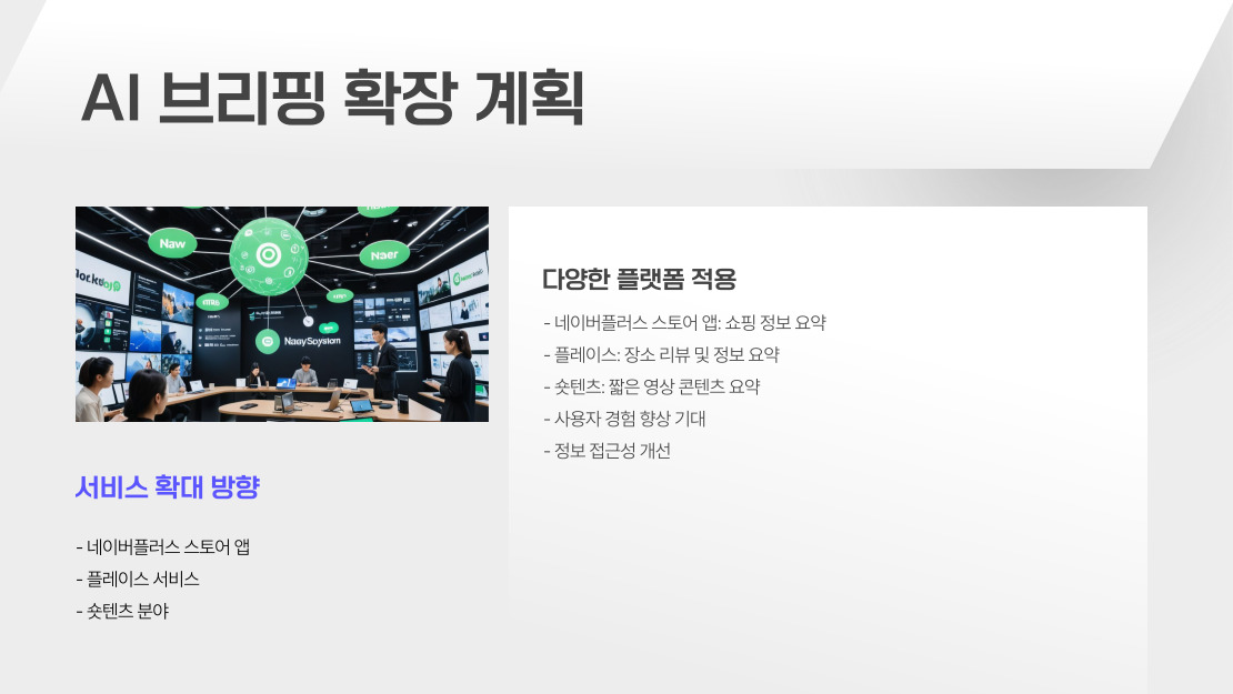AI 브리핑은 단순히 웹 검색 결과에만 머무르지 않습니다. 네이버는 이 기술을 네이버플러스 스토어 앱 내 'AI 쇼핑 가이드', 플레이스 서비스의 '장소 정보 요약', 숏폼 콘텐츠(클립)에서의 '트렌드 요약' 등 다양한 서비스 영역으로 적극 확대 적용할 계획입니다. 이는 네이버 생태계 전반에 걸쳐 사용자 경험을 향상시킬 것으로 기대됩니다.