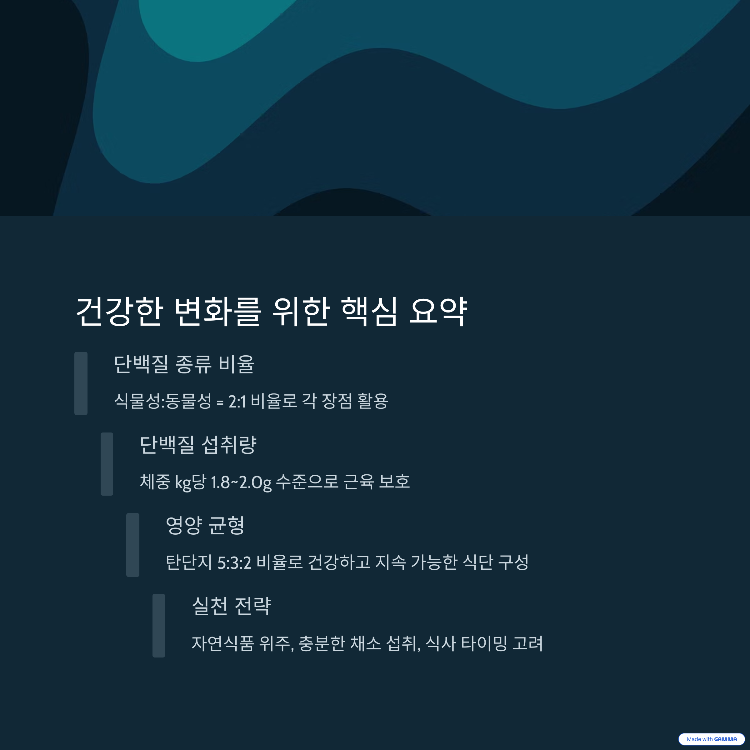결론적으로, 식물성과 동물성 단백질의 장점을 모두 활용하는 2:1 비율 섭취 전략은 근육 유지와 체지방 감량 목표 달성에 시너지 효과를 낼 수 있습니다.