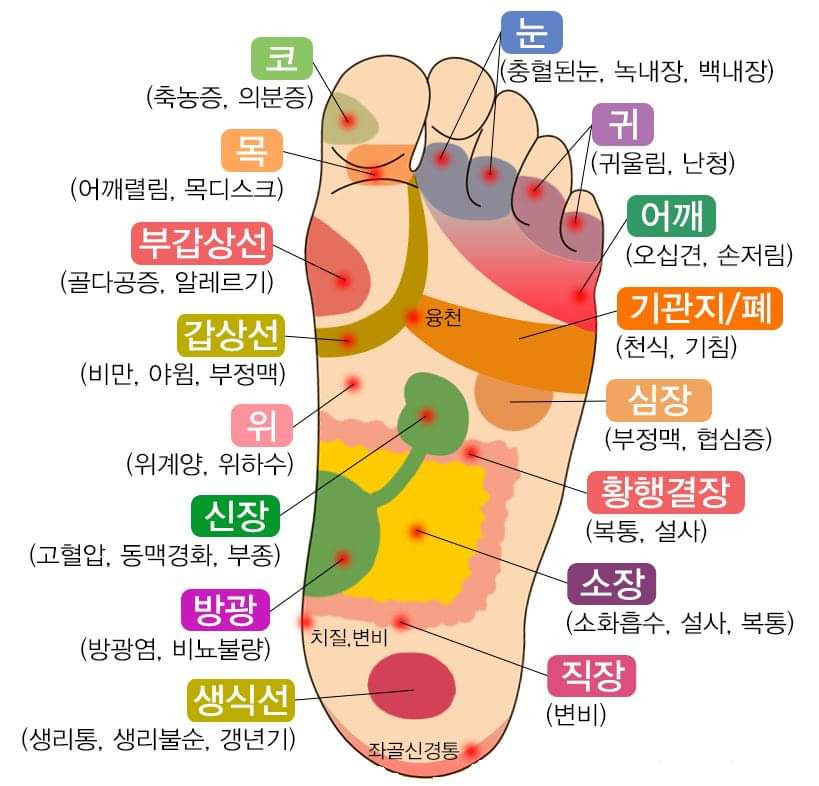 이렇게 기본 반사구 지압을 마친 후에는 관리하고 싶은 특정 발바닥 지압점을 3~5분 정도 추가로 마사지하되, 한 곳을 5분 이상 너무 오래 자극하지 않도록 주의하는 것이 중요합니다.