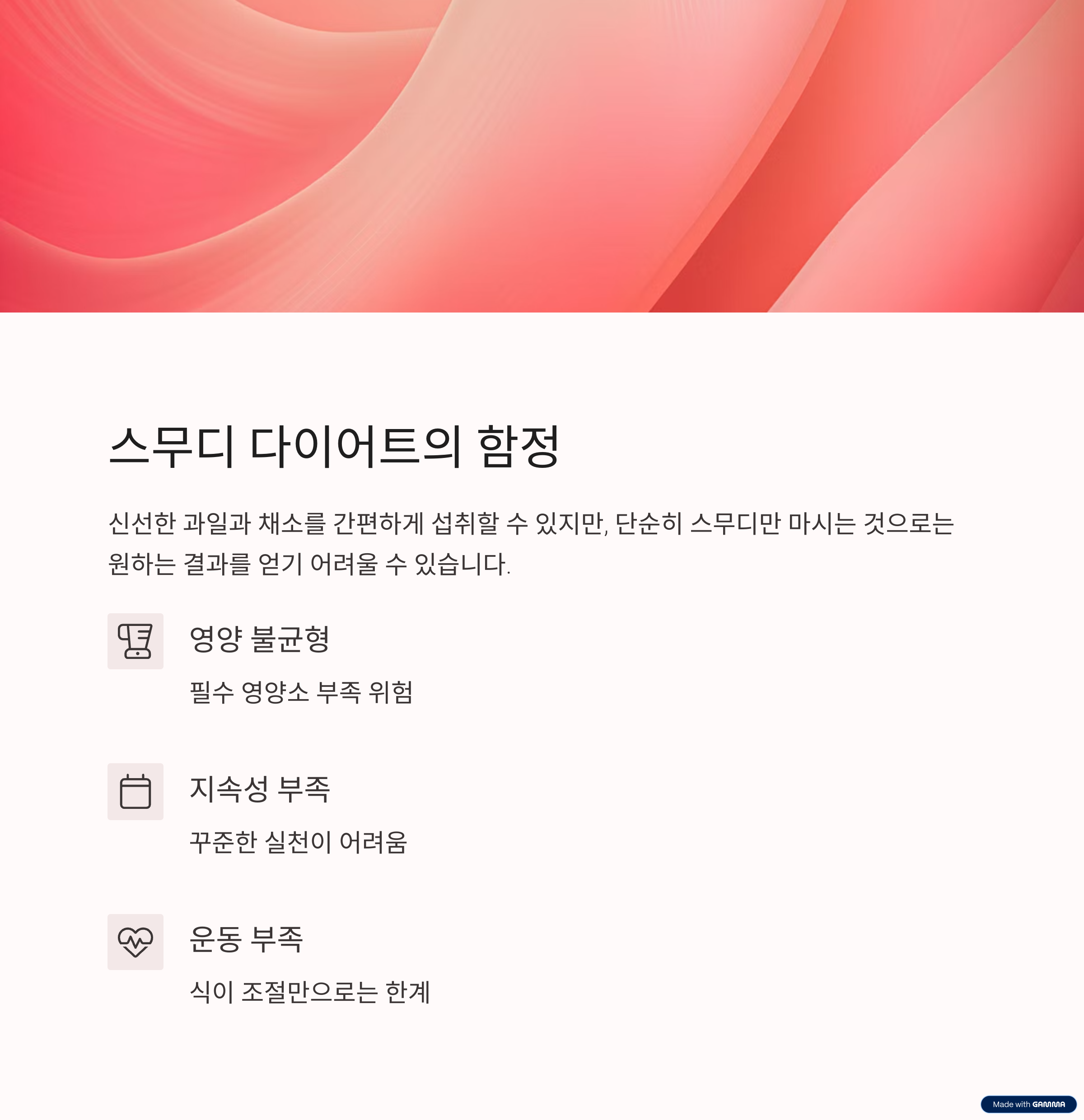 스무디 다이어트는 분명 건강 관리에 매력적인 선택지가 될 수 있습니다. 하지만 '스무디=무조건 성공'이라는 공식은 성립하지 않습니다. 오늘 살펴본 것처럼 영양소 흡수 문제, 영양 불균형, 지속성 부족, 스트레스 관리 미흡, 운동 부족 등 다양한 실패 요인들이 존재하기 때문입니다.