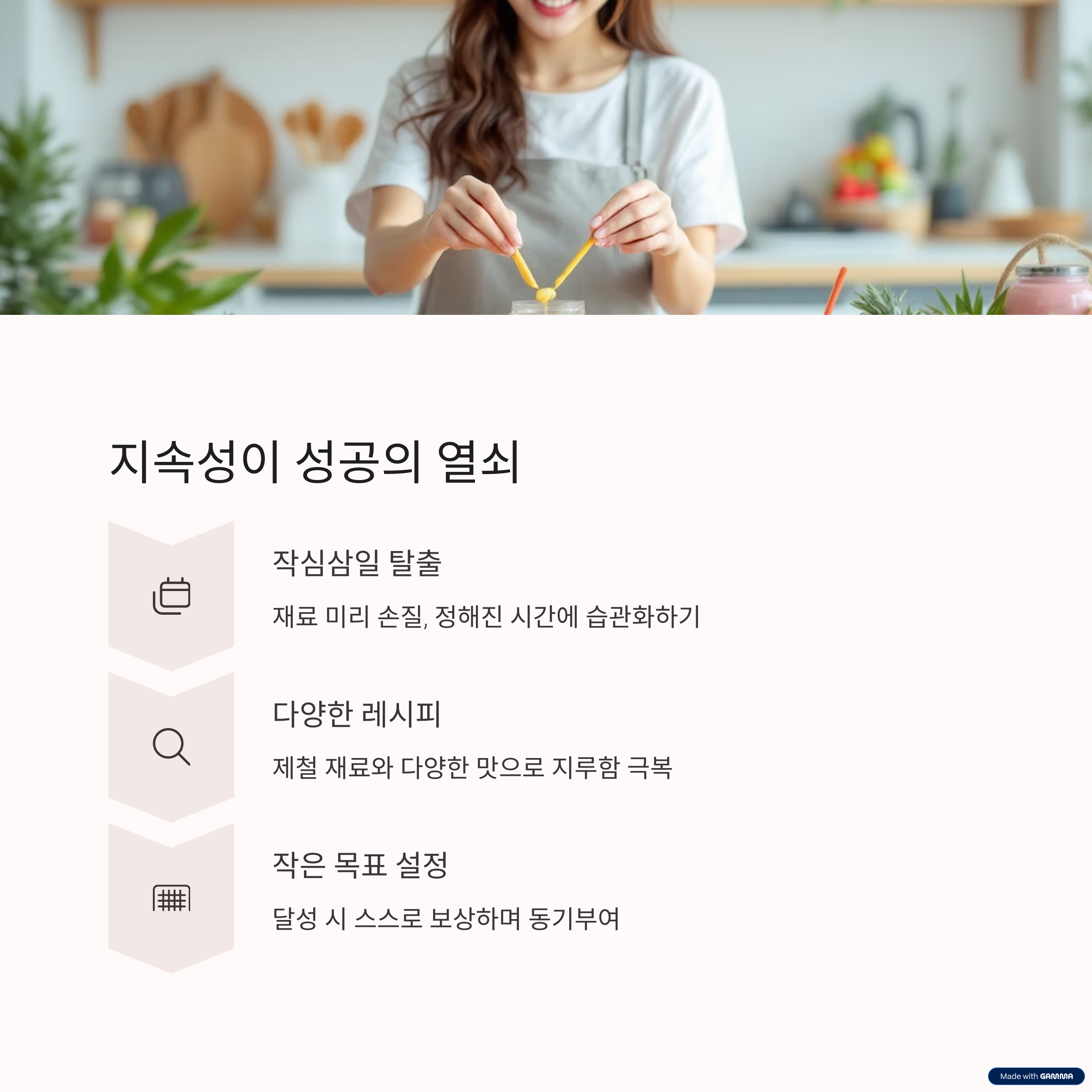 다이어트 실패의 흔한 이유 중 하나가 바로 '지속성 부족'입니다. 처음에는 의욕적으로 시작하지만, 시간이 지나면서 귀찮아지거나 다른 유혹에 쉽게 넘어가기 때문입니다. 스무디 다이어트 역시 매일 재료를 준비하고 만드는 과정이 번거롭게 느껴질 수 있습니다. 이를 극복하기 위해서는 미리 재료를 손질하여 소분해두거나, 매일 같은 시간에 스무디를 만드는 습관을 들이는 것이 좋습니다. 작은 목표를 설정하고 달성했을 때 스스로에게 보상을 해주는 것도 동기 부여에 도움이 됩니다.