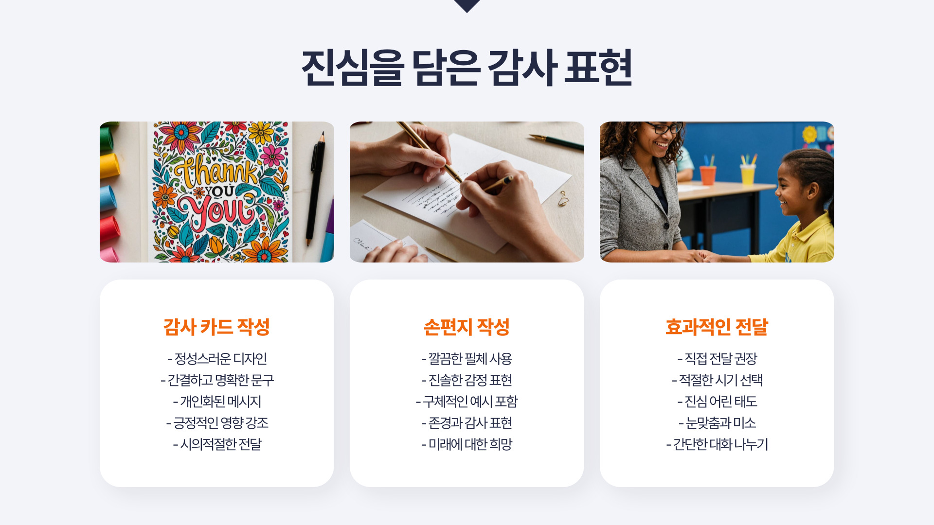 감사 카드나 편지를 작성할 때, 혹은 선생님께 직접 감사의 말씀을 드릴 때, 막연한 감사 표현보다는 구체적인 경험이나 에피소드를 함께 이야기하는 것이 훨씬 더 큰 감동과 진정성을 전달할 수 있습니다.