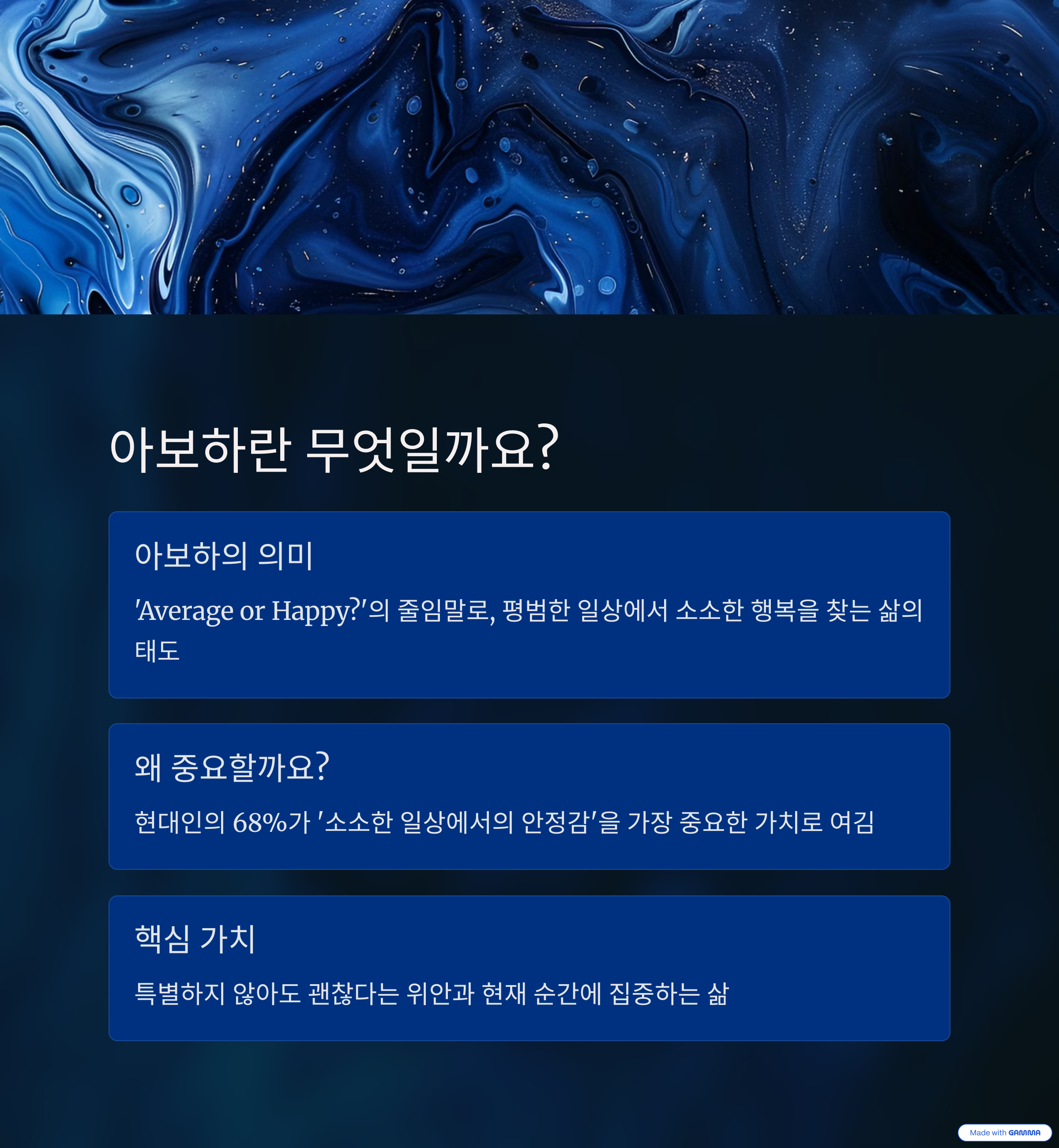 답변: 아보하(Avoha)는 'Average or Happy?'의 줄임말로 해석되기도 하며, 본질적으로는 평범한(Average) 일상 속에서 소소한 행복(Happy)과 만족감을 찾는 삶의 태도를 의미합니다. 경쟁과 성취 중심의 사회에서 번아웃되기 쉬운 현대인들에게, 특별하지 않아도 괜찮다는 위안과 함께 현재 순간에 집중하며 삶의 균형과 내면의 평화를 찾는 것이 중요해졌기 때문에 주목받고 있습니다.