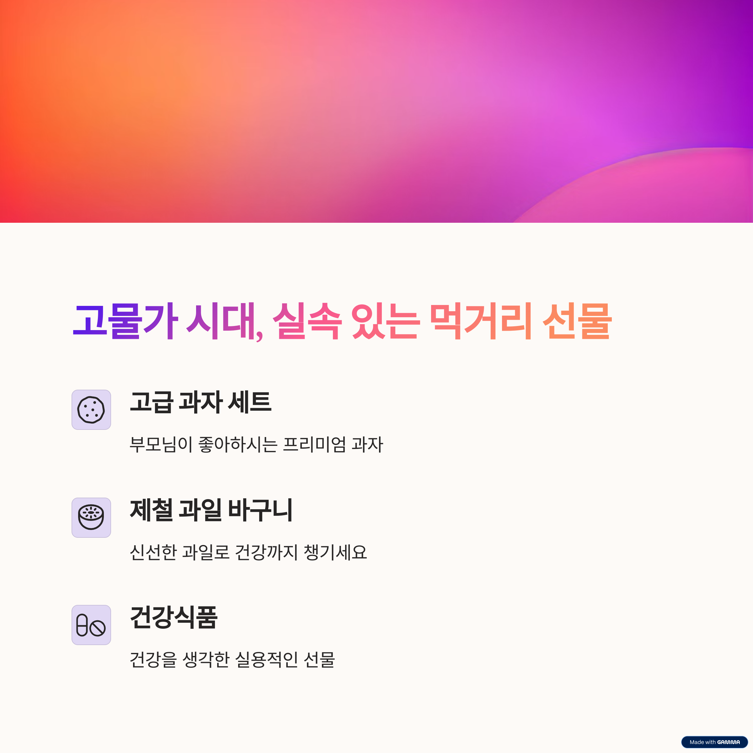 고물가 시대, 실용적인 선물을 찾는 경향이 두드러지면서 '먹거리 선물' 역시 좋은 대안이 되고 있습니다. 카네이션 한 송이 가격도 만만치 않은 요즘, 같은 비용이라면 부모님이 평소 좋아하시는 음식을 선물하는 것이 더 의미 있을 수 있습니다. 🔍