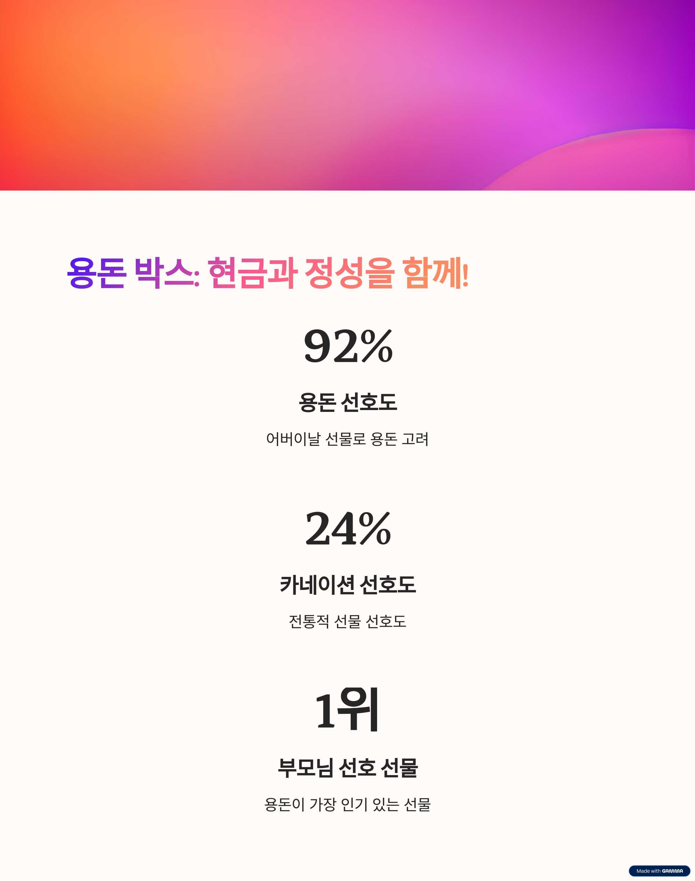 최근 어버이날 선물로 가장 뜨거운 인기를 얻고 있는 것은 단연 '용돈'입니다. 한 설문조사에 따르면, 어버이날 선물로 현금이나 용돈을 고려한다는 응답이 92%에 달한 반면, 카네이션은 24%에 그쳤다고 합니다. 단순히 봉투에 넣어 드리는 것보다 조금 더 특별하게 마음을 전하고 싶다면 '용돈 박스'를 추천합니다. 👍