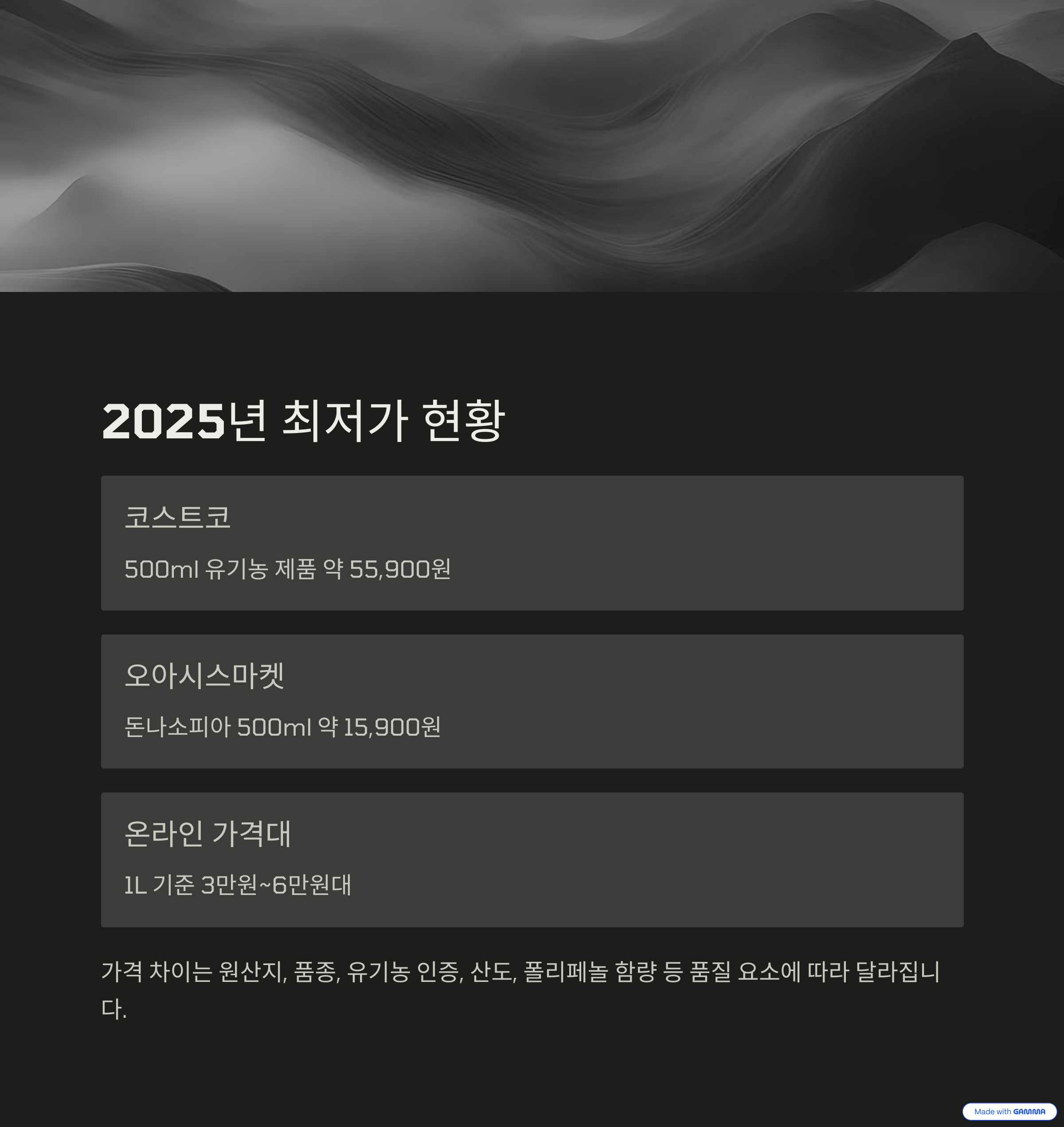 - 🌿 오아시스마켓: 신선식품 배송으로 유명한 오아시스마켓에서는 '돈나소피아 엑스트라버진 올리브오일' 500ml 제품이 100ml당 약 3,180원에 판매 중입니다. 이를 500ml 한 병 가격으로 환산하면 약 15,900원 선으로, 상대적으로 매우 저렴한 가격대를 형성하고 있습니다.