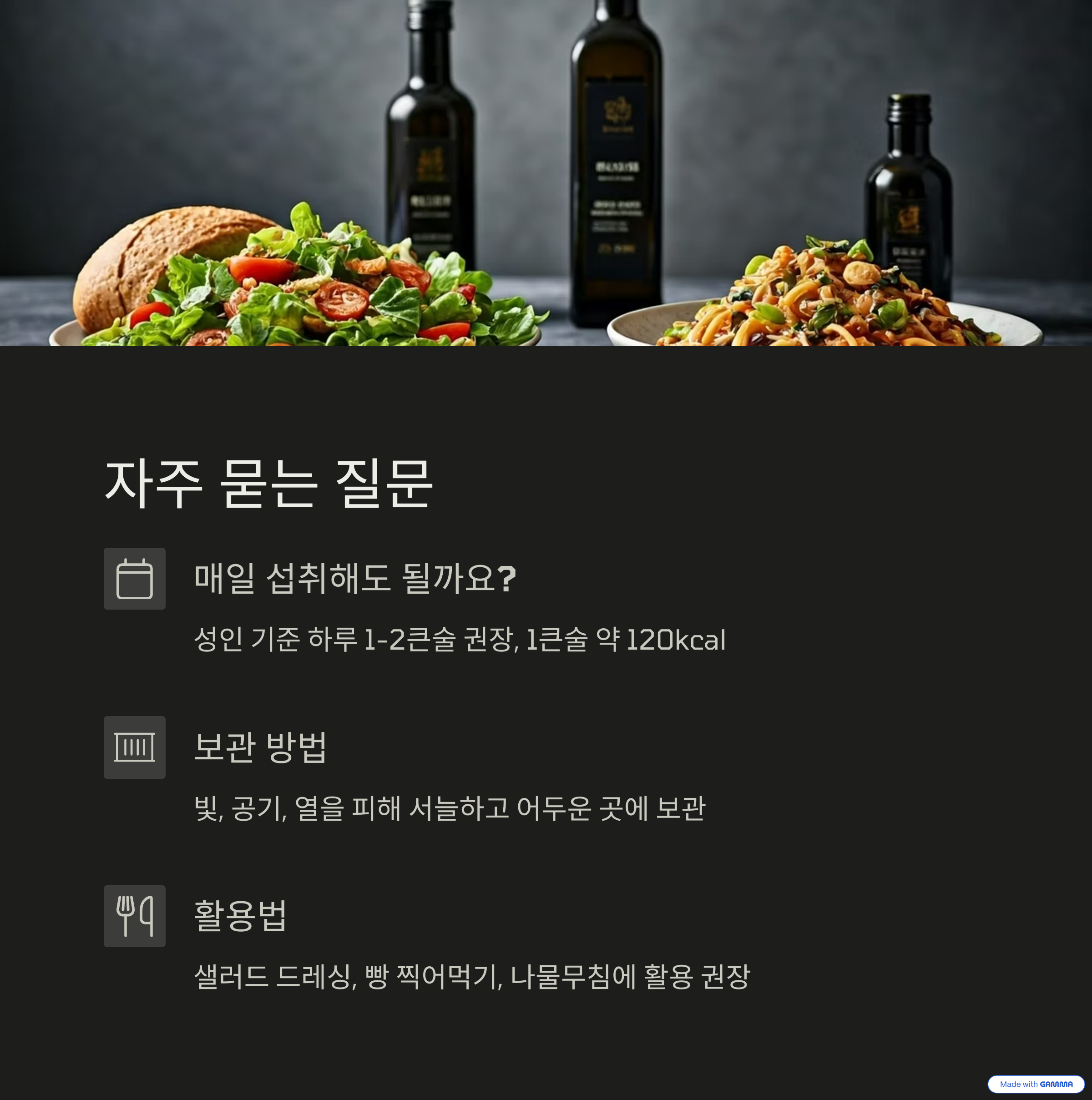 - 냉압착(Cold Pressed) 확인: 열을 가하지 않고 물리적인 압력만으로 오일을 추출하는 방식입니다. 영양소 파괴를 최소화하여 최상의 품질을 유지할 수 있습니다.