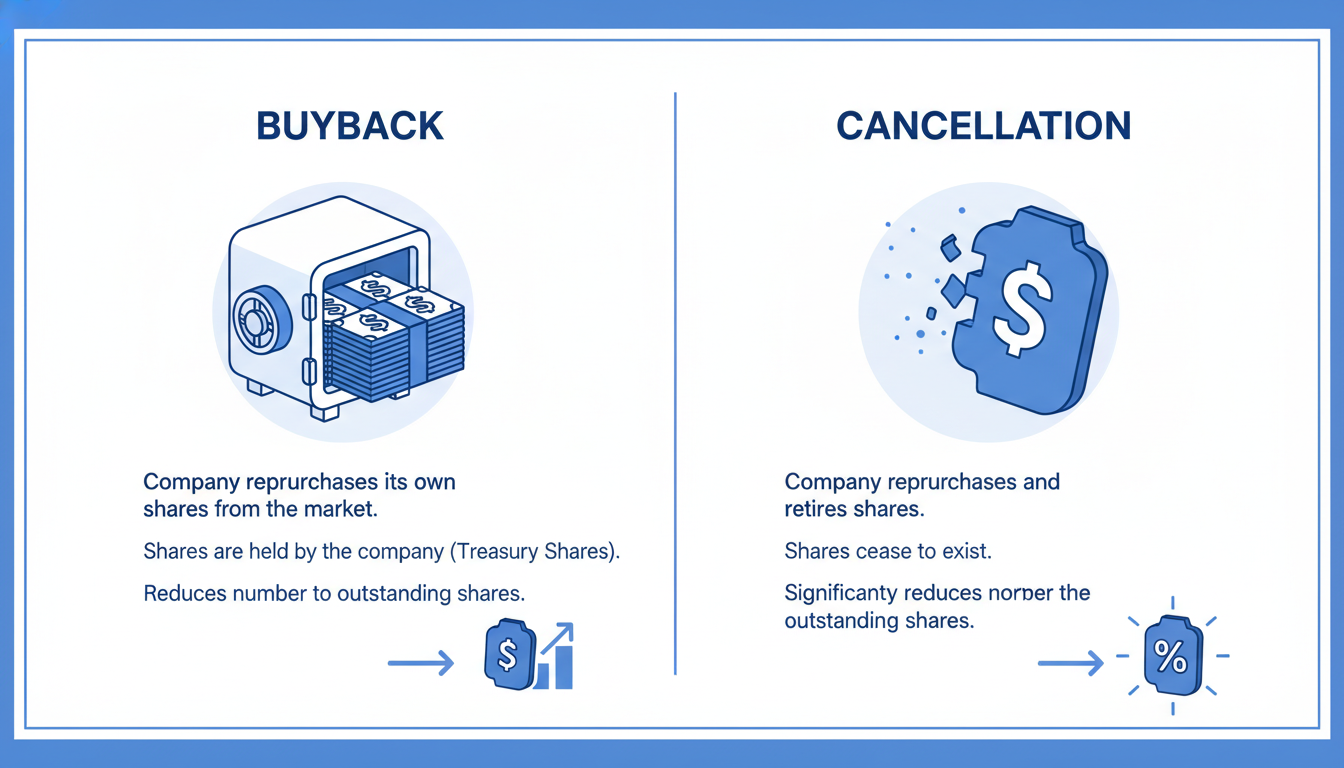 단순 매입만으로는 주주환원 효과가 완성되었다고 보기 어렵습니다. 왜냐하면 기업이 다시 그 주식을 시장에 팔 수 있기 때문입니다. 반면 소각은 다음과 같은 강력한 이점을 가집니다.