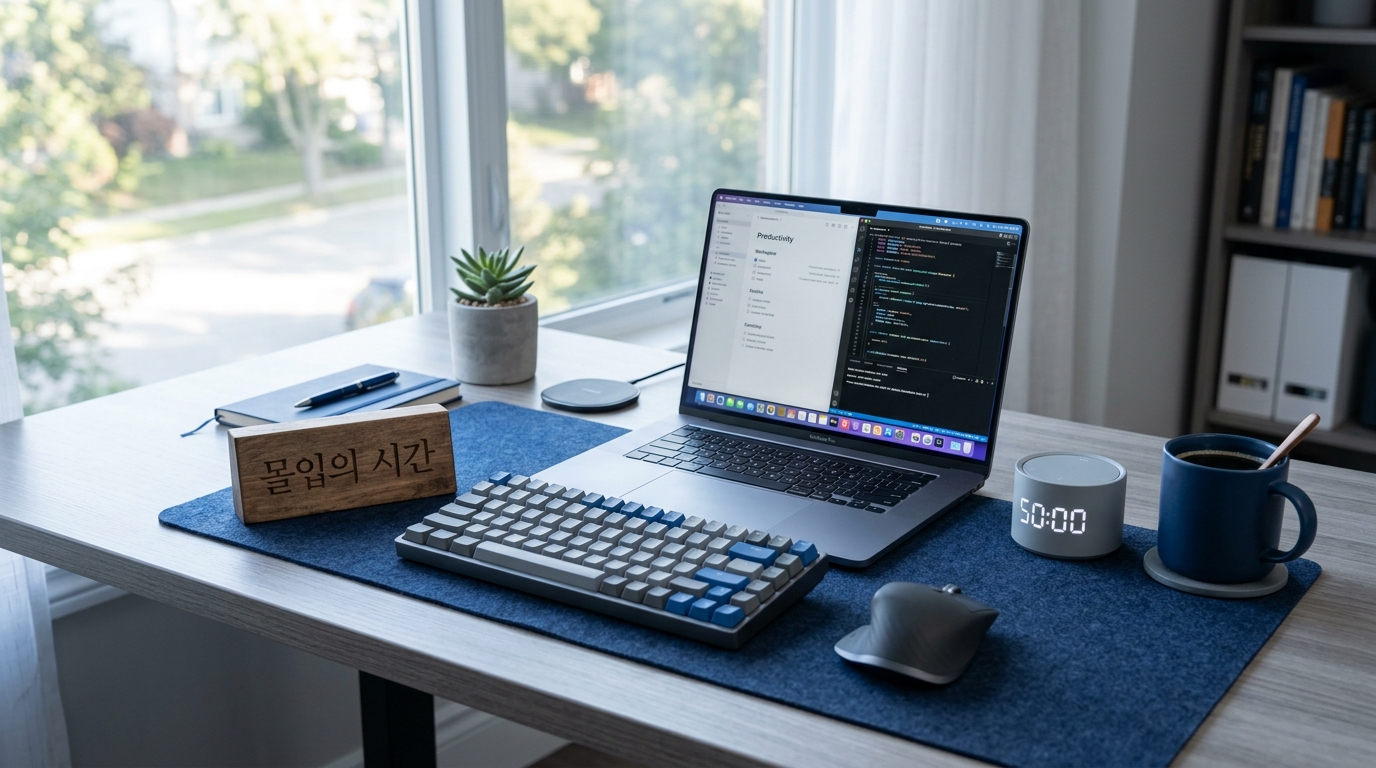 차분한 블루 톤의 데스크 매트와 업무용 노트북 및 타이머