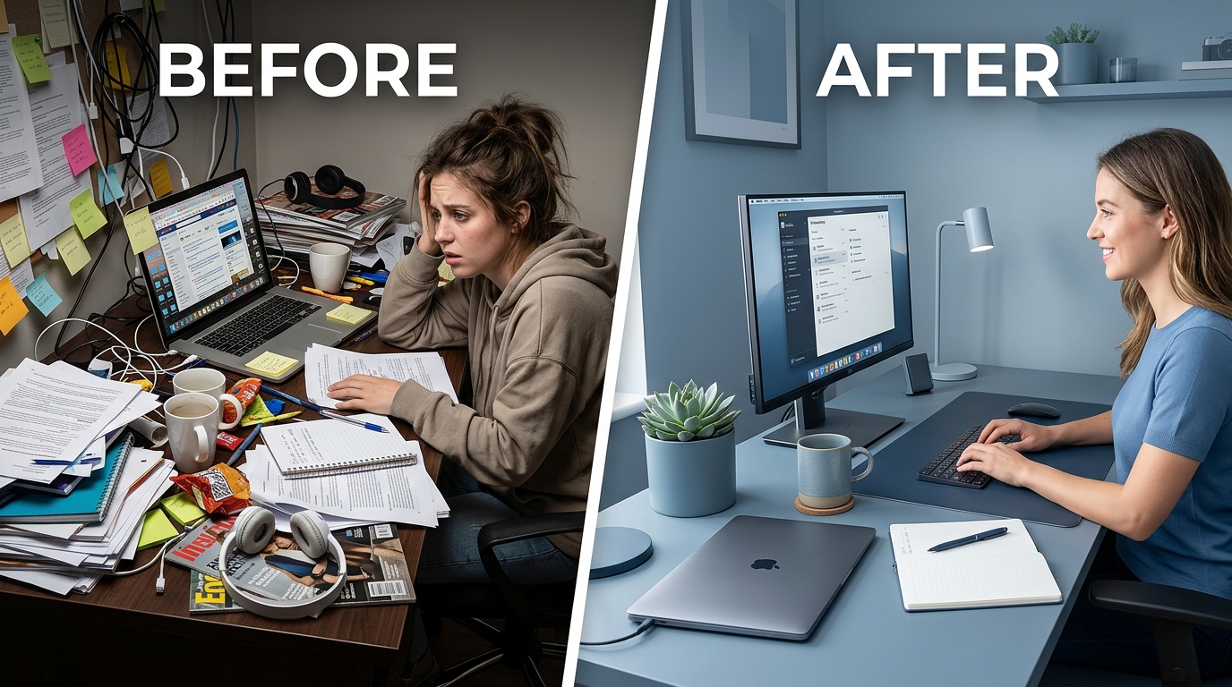 블루와 그레이 톤으로 꾸며진 생산성 높은 재택근무 책상 환경