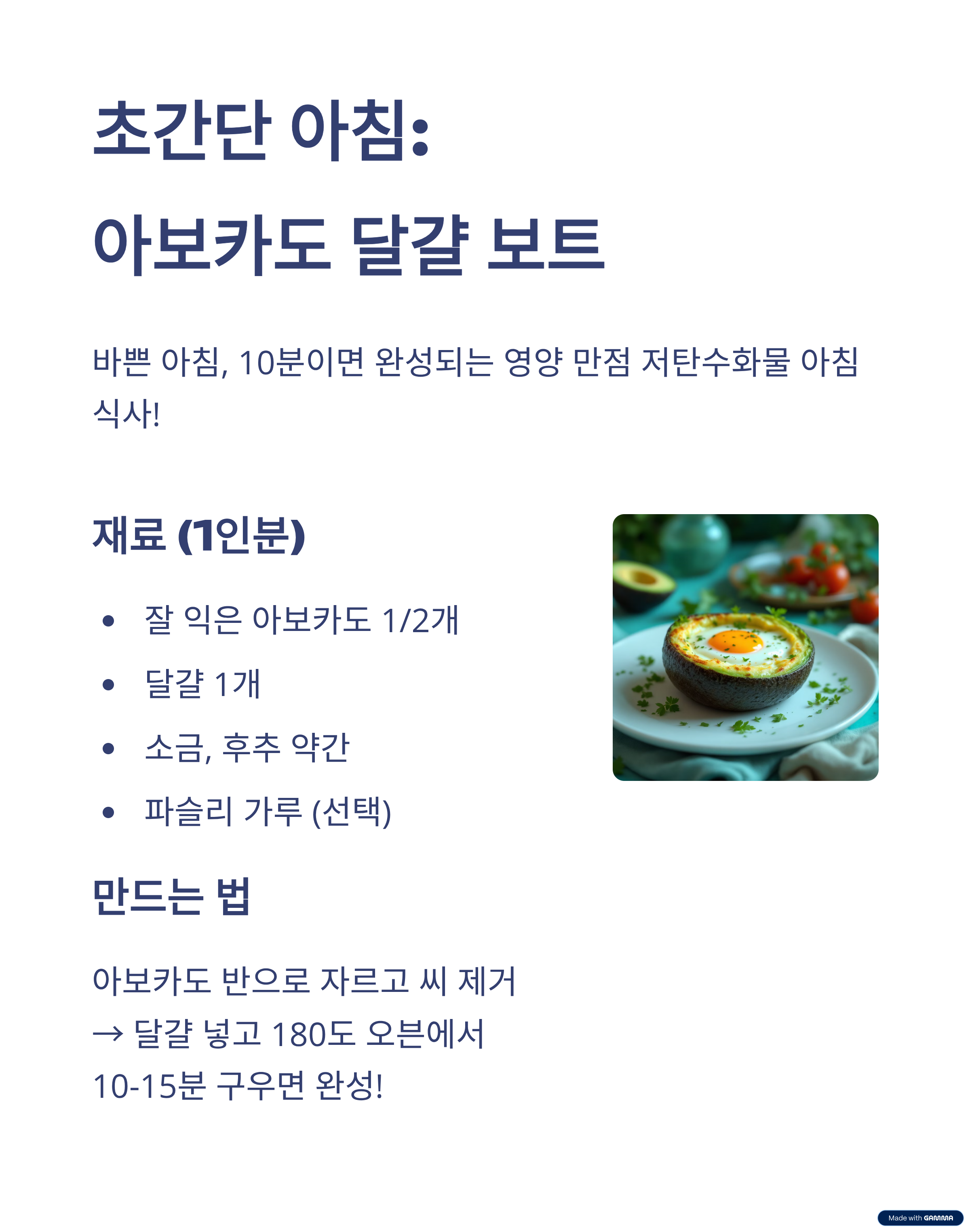 바쁜 아침, 굶지 마세요! 10분이면 충분한 영양 만점 저탄수화물 아침 식사로 하루를 활기차게 시작할 수 있습니다.