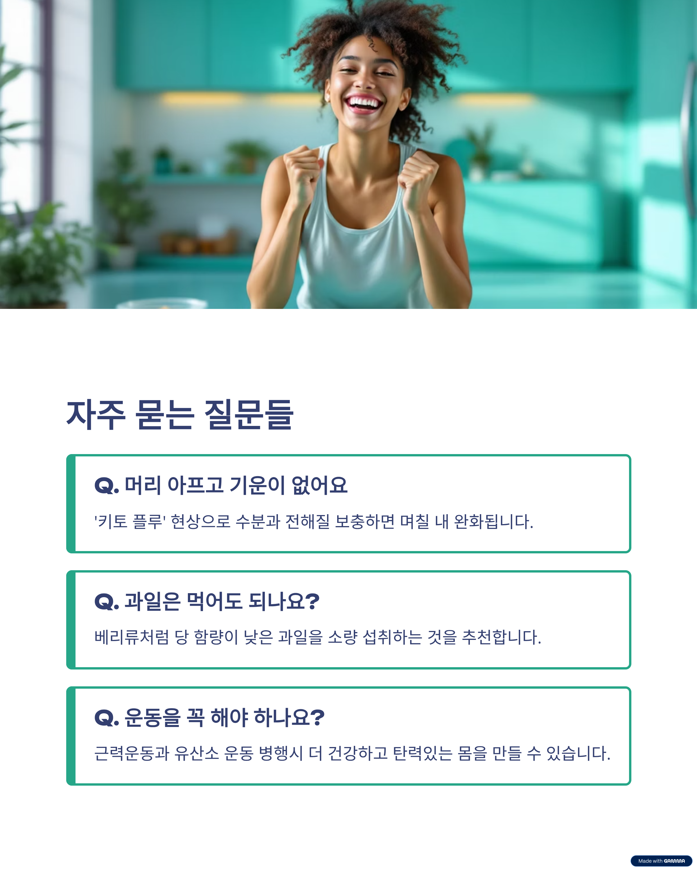 A. 이는 '키토 플루(Keto Flu)'라고 불리는 초기 적응 현상일 수 있습니다. 우리 몸이 탄수화물 대신 지방을 주 에너지원으로 사용하기 시작하면서 겪는 일시적인 증상입니다. 충분한 수분과 나트륨(소금), 칼륨, 마그네슘 등 전해질을 보충해주면 며칠 내로 완화되는 경우가 대부분입니다.