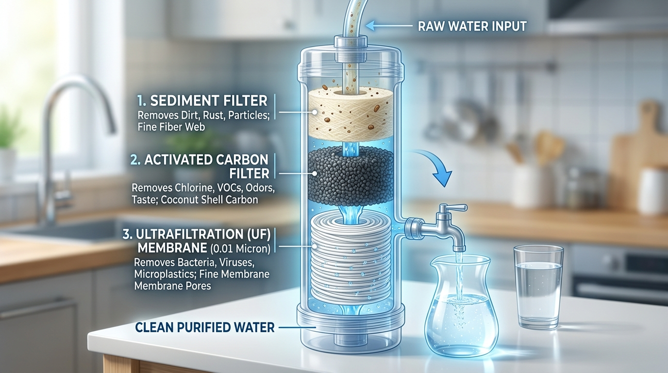 정수기 내부 필터들의 구성과 구조를 보여주는 상세 일러스트