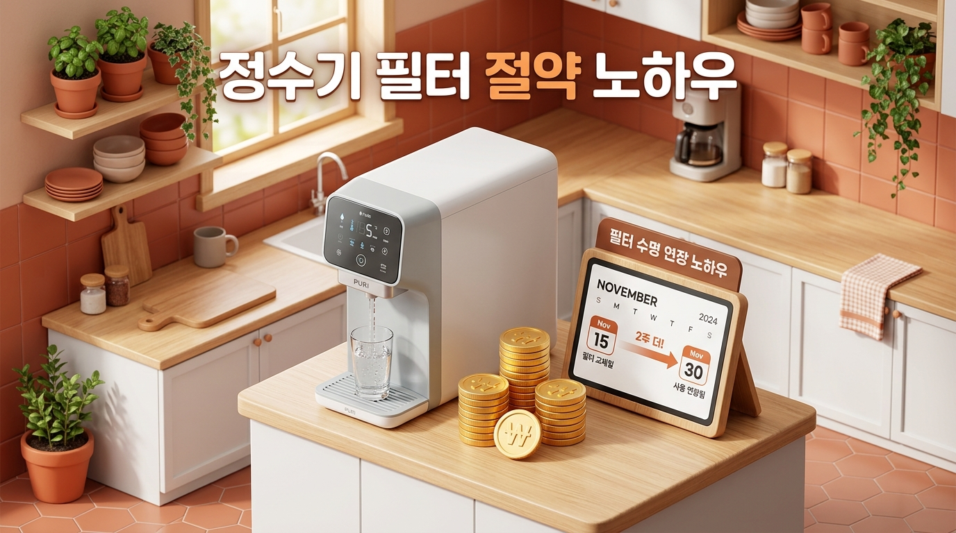 정수기와 동전이 놓인 깔끔한 주방 모습으로 필터 절약을 상징하는 이미지