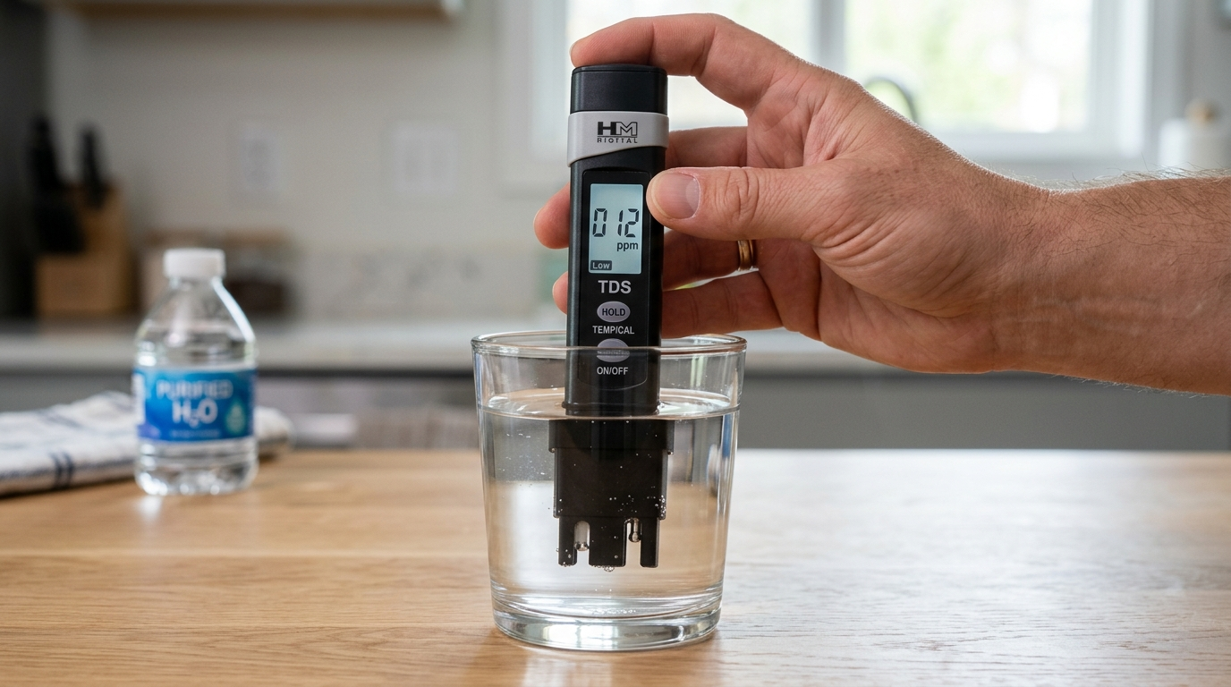 수질 측정기(TDS)를 사용하여 정수기 물 상태를 확인하는 모습