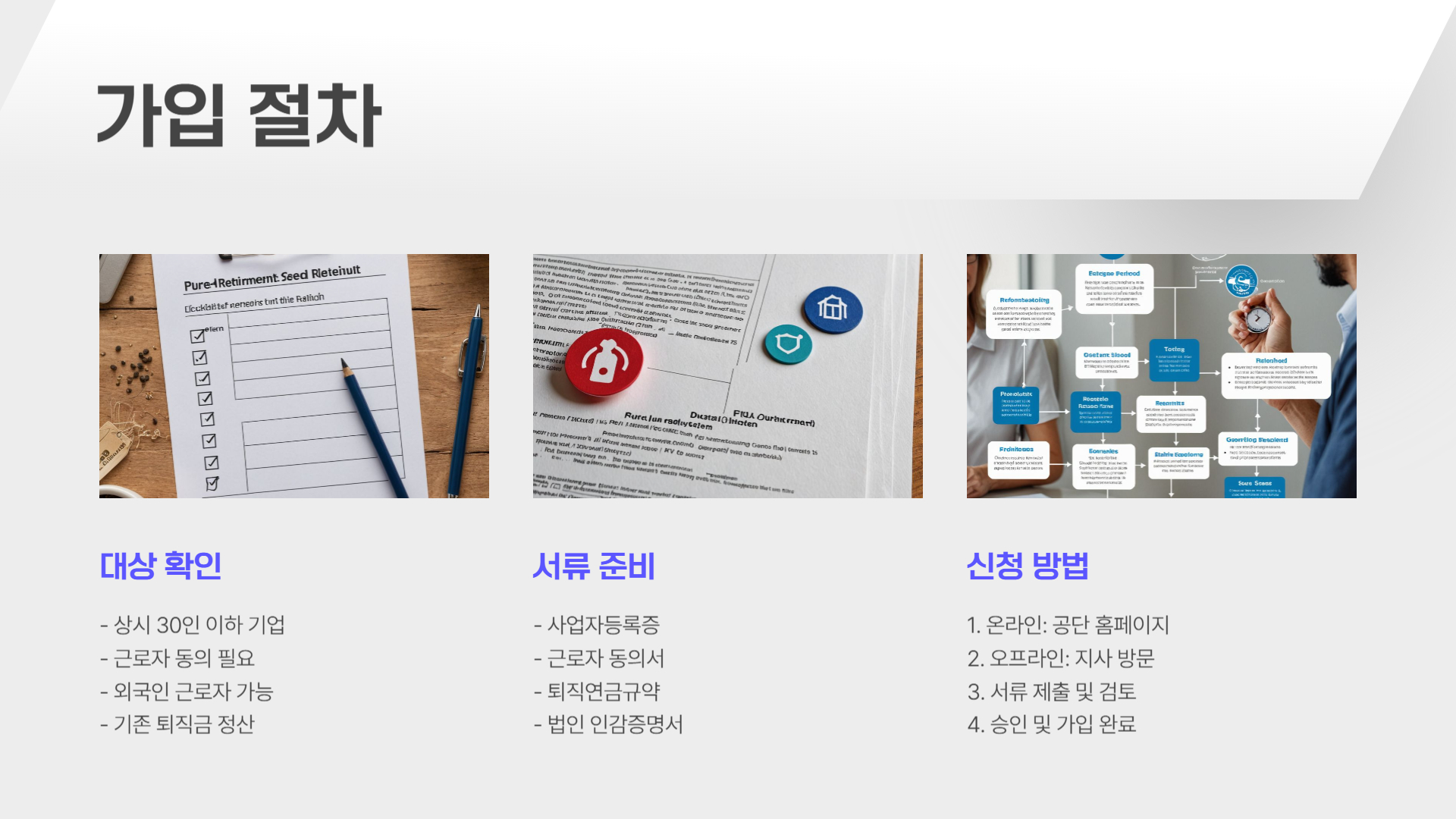 - 가입 완료: 근로복지공단에서 가입 승인 후, 퇴직연금 제도 운영 시작