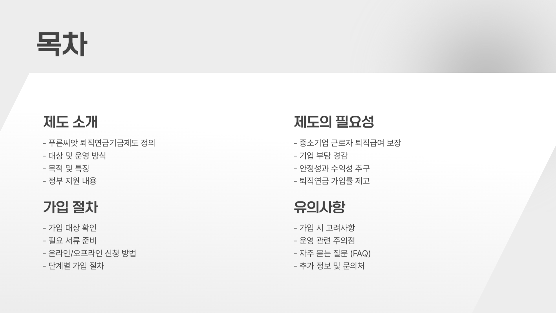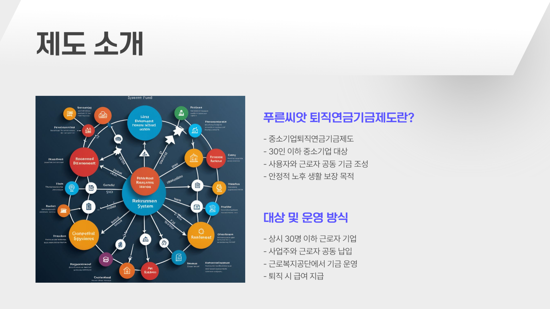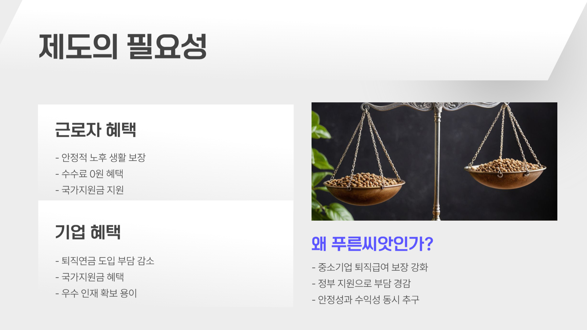 푸른씨앗 퇴직연금기금제도는 근로복지공단이 운영하는 공적 퇴직연금 제도입니다. 30인 이하 중소기업의 퇴직연금 도입을 촉진하고, 근로자의 노후 소득 보장을 강화하기 위해 마련되었습니다.