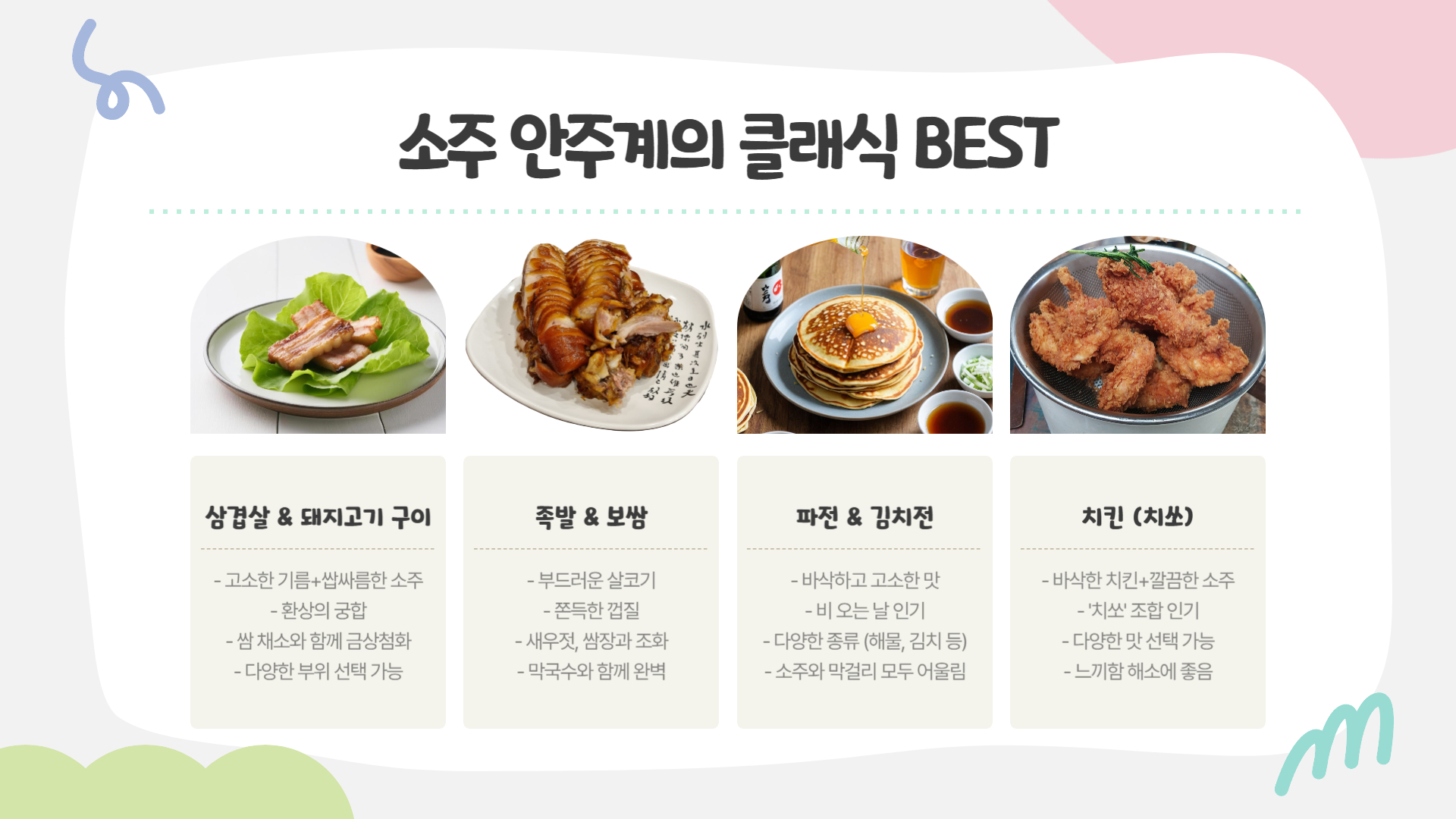 안녕하세요! 우리네 삶의 희로애락과 함께하는 술, 소주! 그 옆자리를 든든하게 지켜주는 '안주'에 대한 모든 것을 파헤쳐 보는 상식창고입니다. 😊