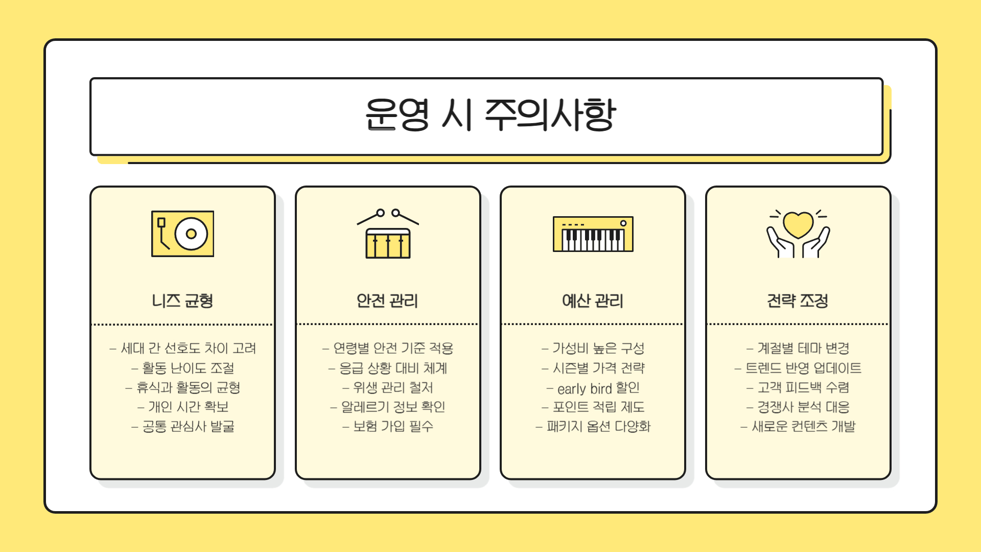 - ✔️ 모든 가족의 니즈가 같을 수는 없습니다. 기본적인 패키지 구성 외에 추가 비용을 내고 다른 활동이나 서비스를 선택할 수 있는 옵션을 제공하면 만족도를 높일 수 있습니다.