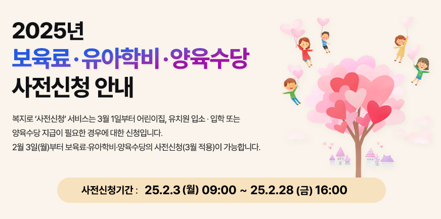 2025년 보육료, 유아학비, 양육수당 사전신청25년 2월 3일(월)부터 2월 25일(금) 18시까지 진행됩니다. 🗓️ 사전신청 대상2025년 3월 신규로 보육료, 유아학비, 양육수당지급받을 예정인 영유아입니다. 복지로 웹사이트 (www.bokjiro.go.kr) 또는 복지 로 모바일 앱을 통해 간편하게 신청하세요! 💻📱 사전신청 기간놓치지 마시고 미리 신청하여 2025년에도 든든하게 육아하세요! 💪