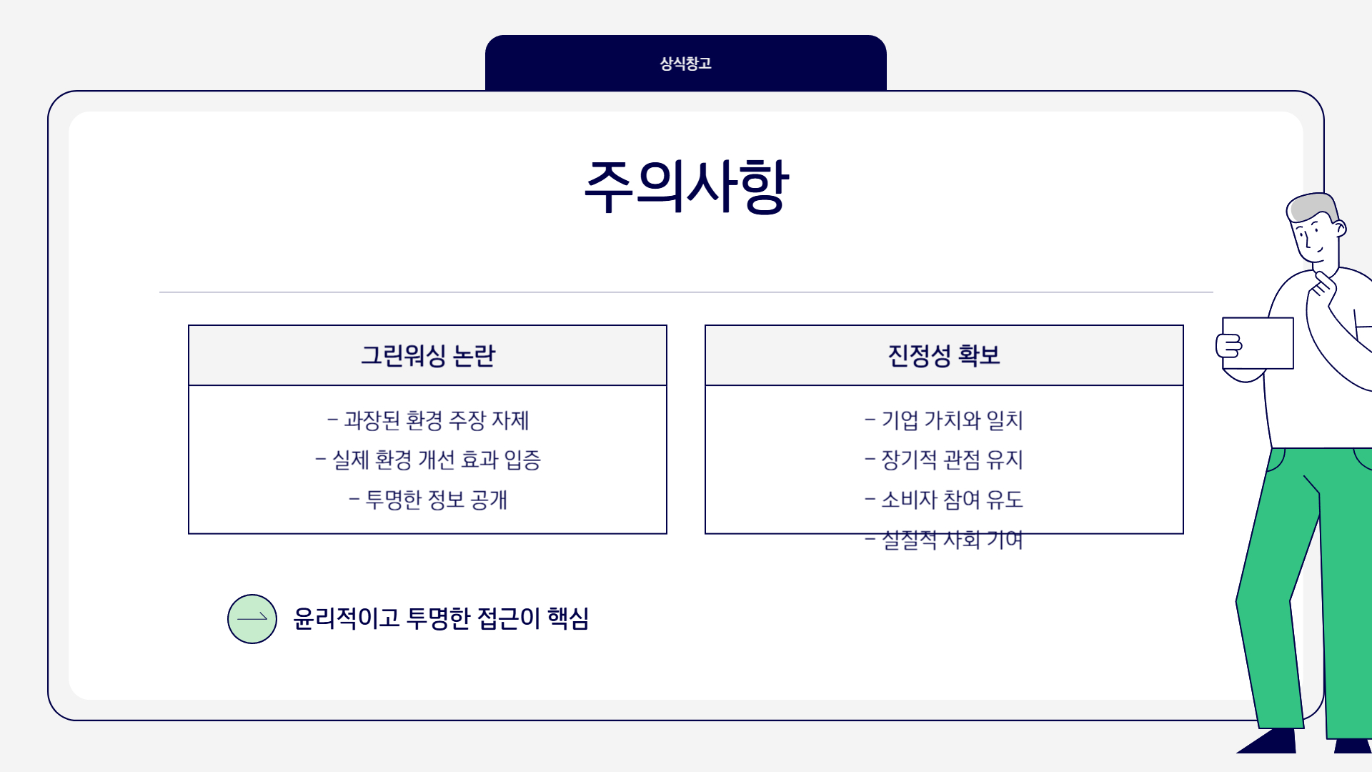 - ✔️ 진정성: 단기적인 이익 추구가 아닌, 문제 해결에 대한 진심과 의지가 느껴져야 합니다.