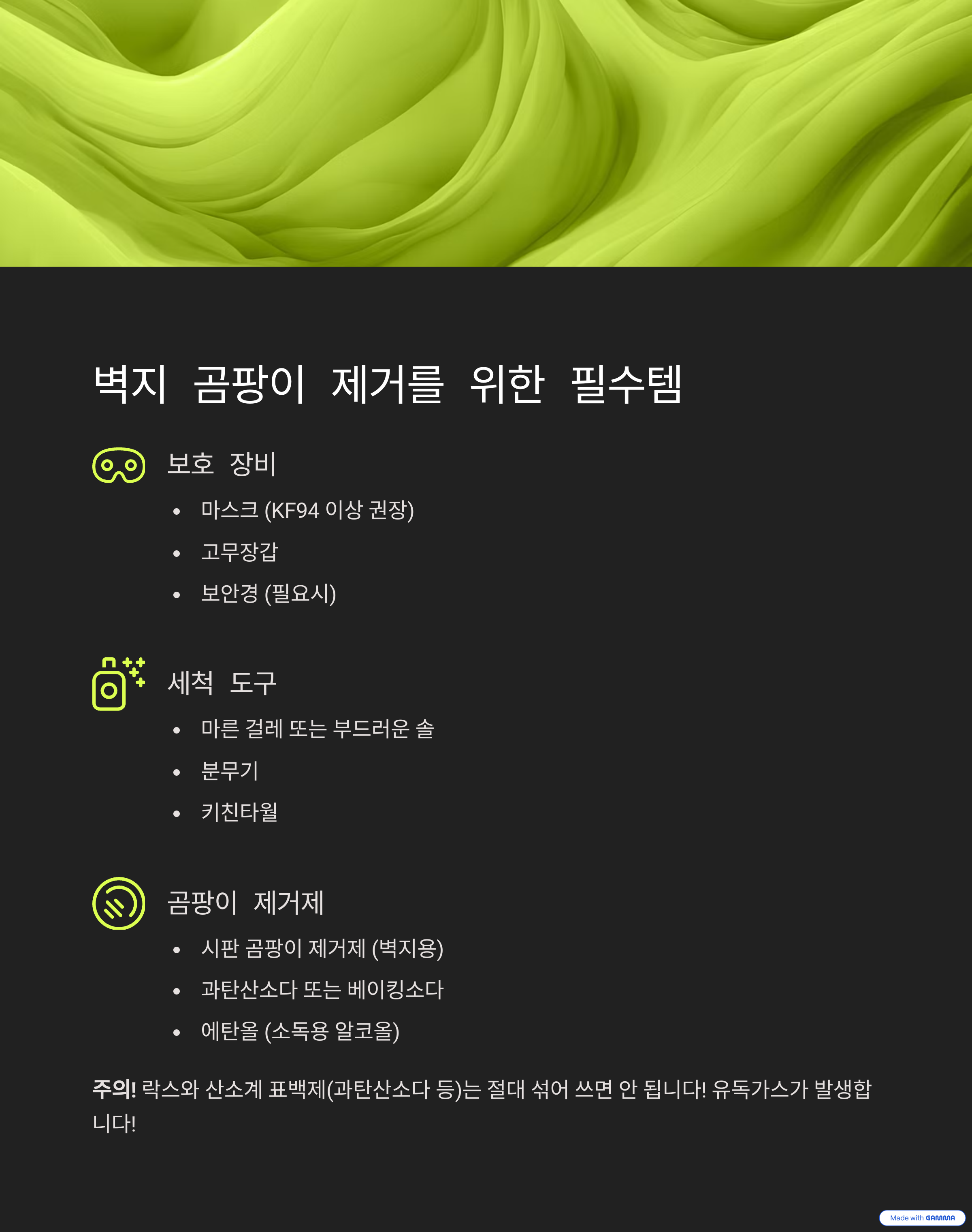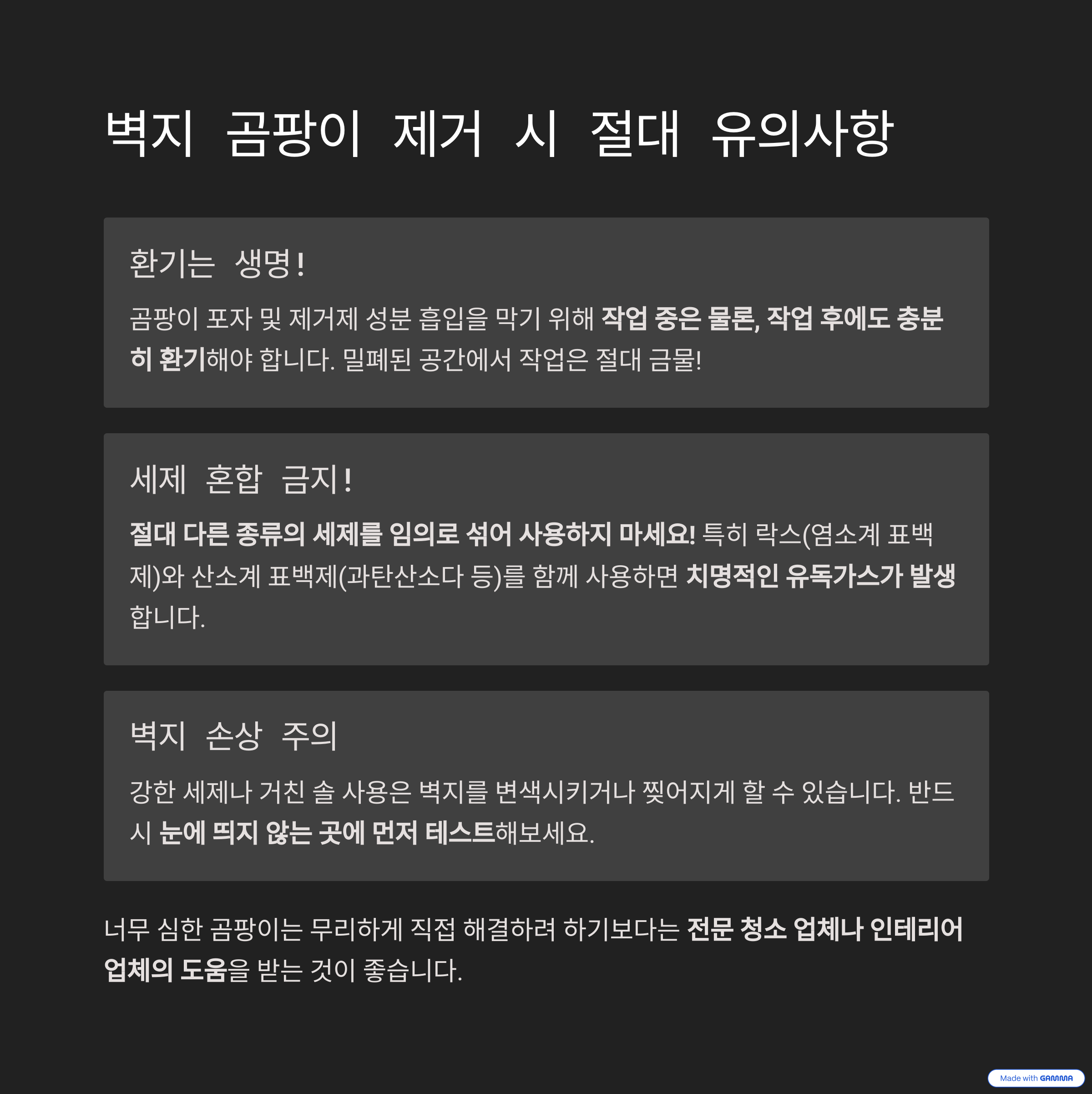 - 🌬️ 환기는 생명!: 곰팡이 포자 및 제거제 성분 흡입을 막기 위해 작업 중은 물론, 작업 후에도 충분히 환기해야 합니다. 밀폐된 공간에서 작업은 절대 금물!