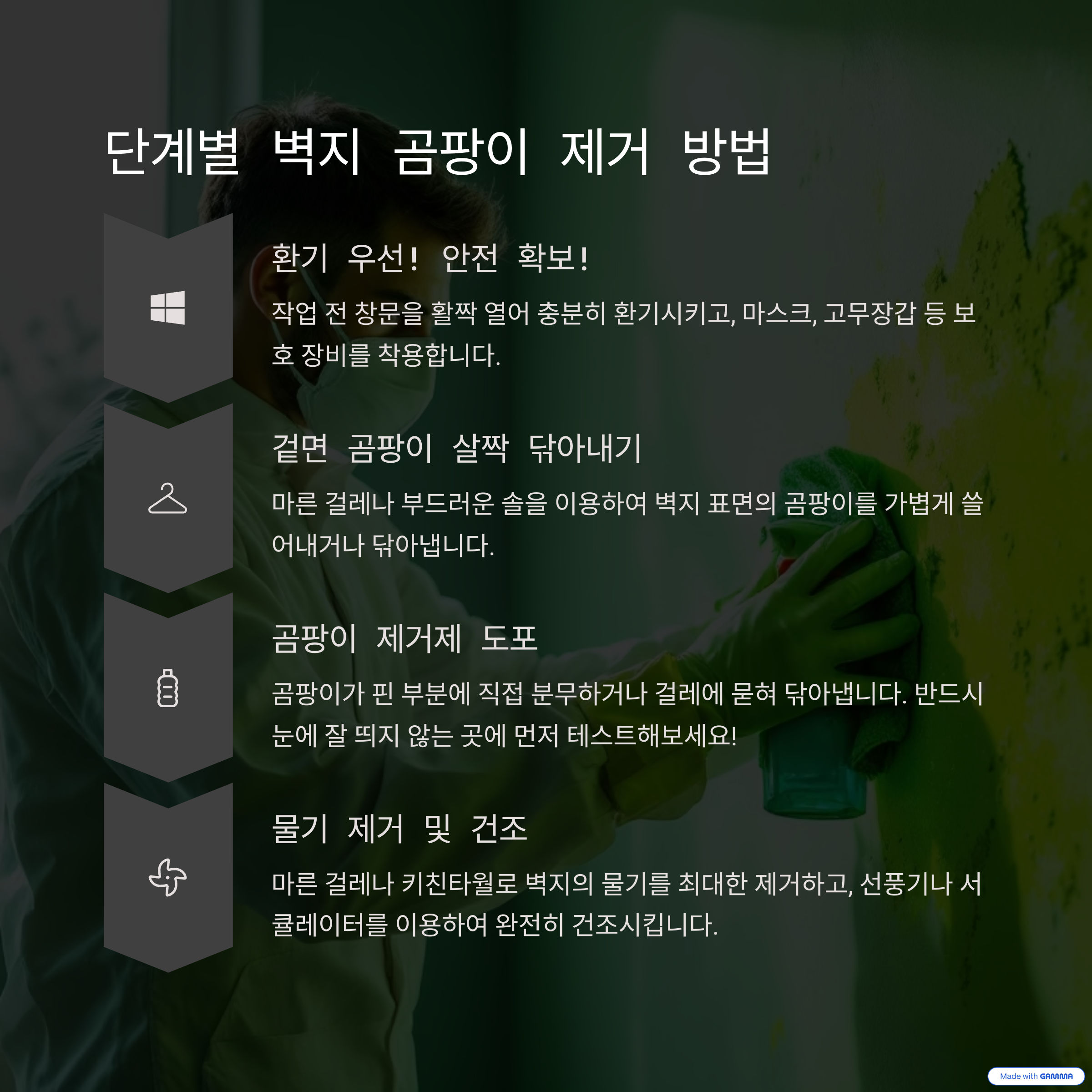 - 😔 너무 심한 곰팡이는 전문가에게!: 곰팡이 범위가 너무 넓거나, 벽지 안쪽까지 심하게 번졌거나, 누수 등 근본적인 원인 해결이 필요한 경우에는 무리하게 직접 해결하려 하기보다는 전문 청소 업체나 인테리어 업체의 도움을 받는 것이 좋습니다.