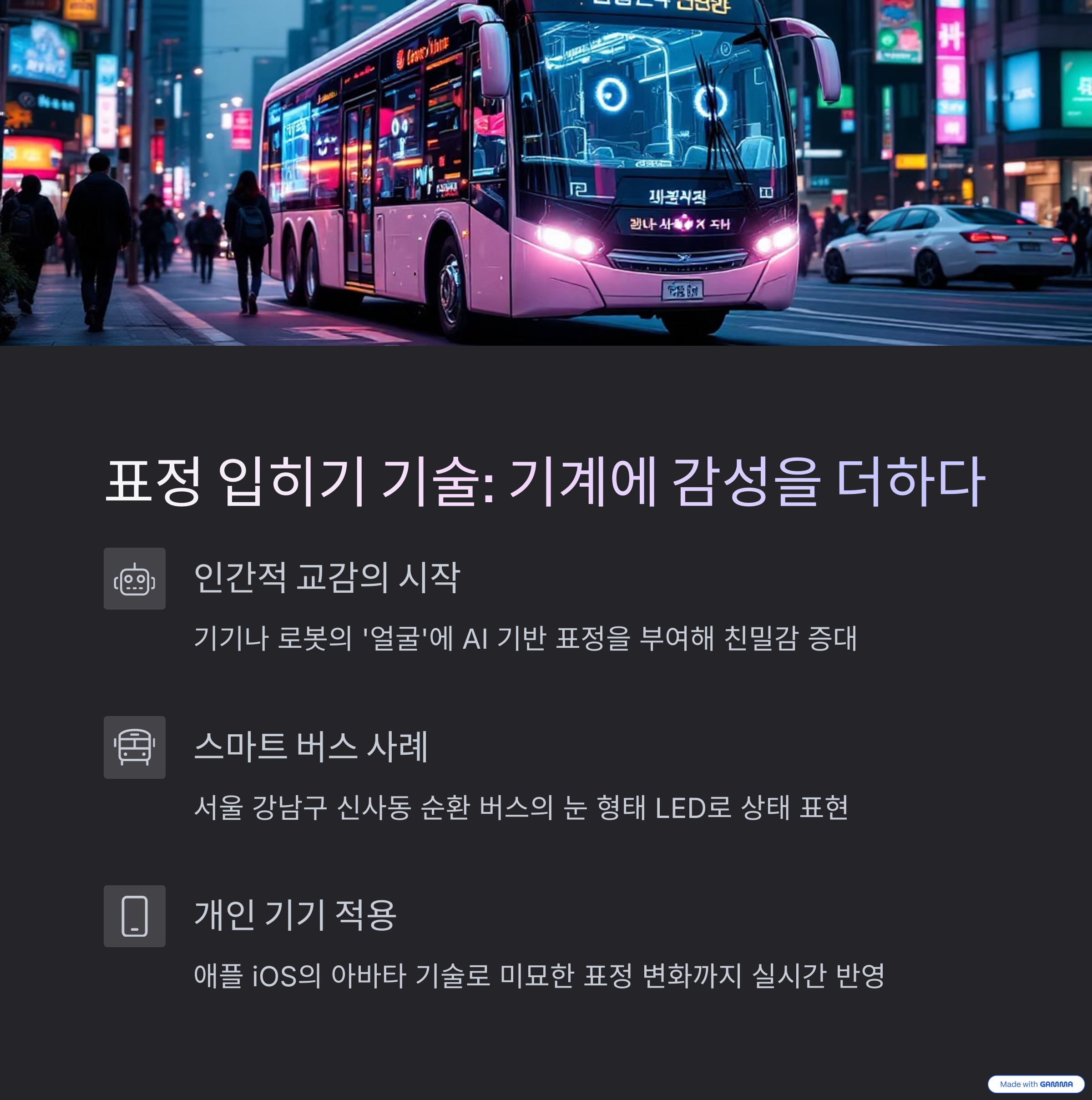 대표적인 사례로는 서울시의 스마트 버스를 들 수 있습니다. 일부 노선(예: 강남구 신사동 순환 버스)에서는 헤드라이트 부분에 눈 형태의 LED를 적용하여 버스의 상태나 움직임을 시각적으로 표현하려는 시도를 하고 있습니다. 버스가 정차하거나 출발할 때, 혹은 보행자를 인식했을 때 눈 모양이 바뀌는 식이죠. (참고 위치: 서울 강남구 신사동 611-1 공용주차장 부근)