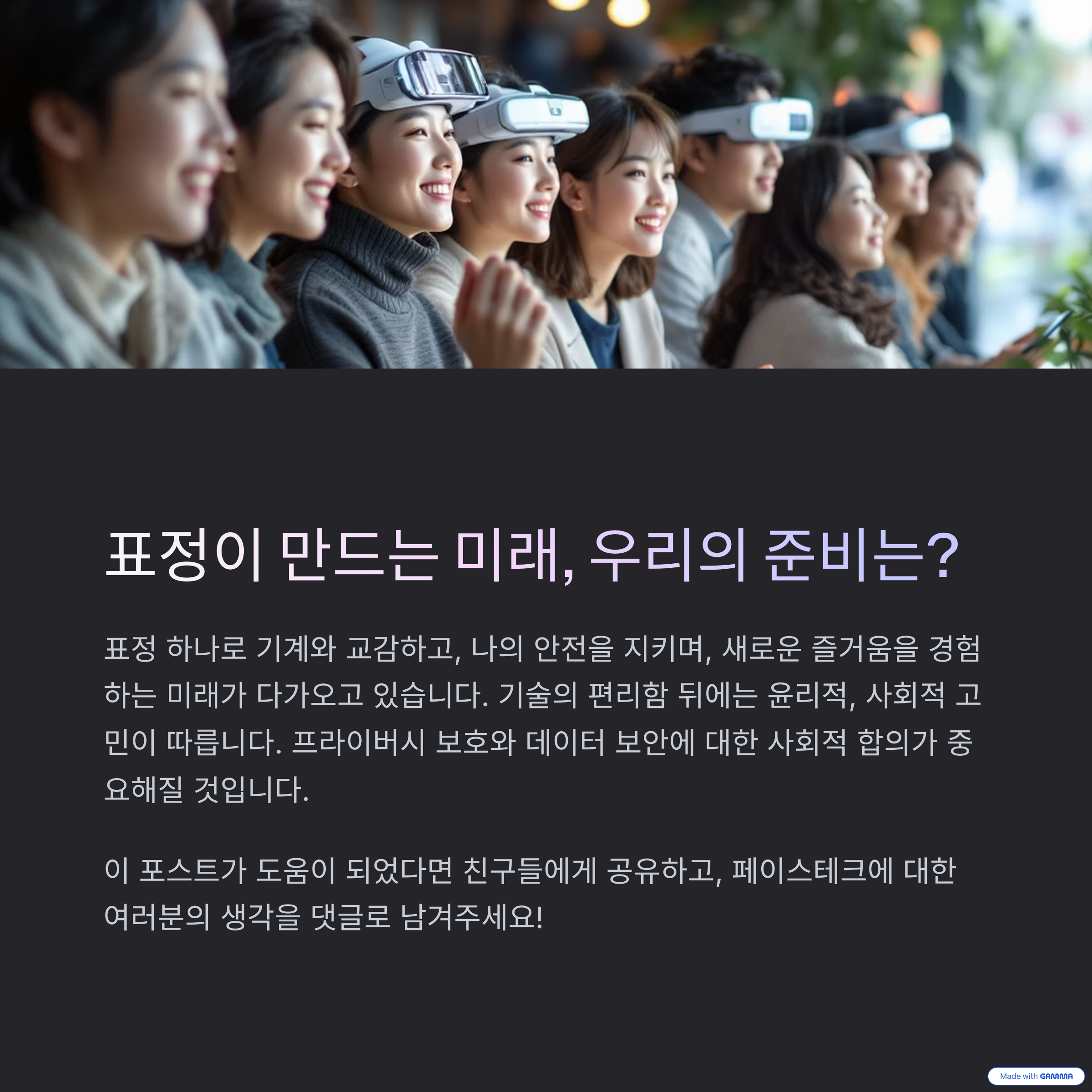 표정 하나로 기계와 교감하고, 나의 안전을 지키며, 새로운 즐거움을 경험하는 미래가 다가오고 있습니다. 이러한 변화의 흐름 속에서 우리는 기술을 어떻게 받아들이고 활용해야 할까요? 페이스테크가 가져올 미래 사회의 모습에 대해 여러분은 어떤 기대를 하고 계신가요? 다양한 의견을 나눠주시면 좋겠습니다. 😊