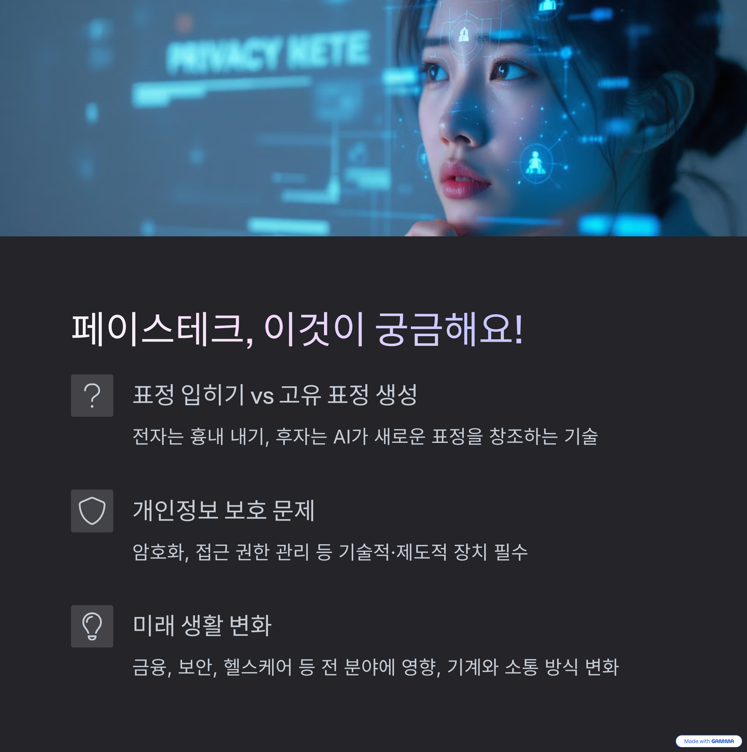 지금까지 2025년을 이끌어갈 핵심 기술 중 하나인 페이스테크의 세 가지 주요 유형과 다양한 활용 사례를 살펴보았습니다. 인간의 가장 기본적인 소통 수단인 '표정'을 이해하고, 활용하며, 심지어 생성하기까지 하는 이 기술은 분명 우리 사회에 큰 변화를 가져올 것입니다. 기술이 주는 편리함과 효율성 뒤에는 항상 윤리적, 사회적 고민이 따르기 마련입니다. 특히 얼굴이라는 매우 개인적인 정보를 다루는 만큼, 기술 발전과 더불어 프라이버시 보호와 데이터 보안에 대한 사회적 합의와 제도적 뒷받침이 중요해질 것입니다.