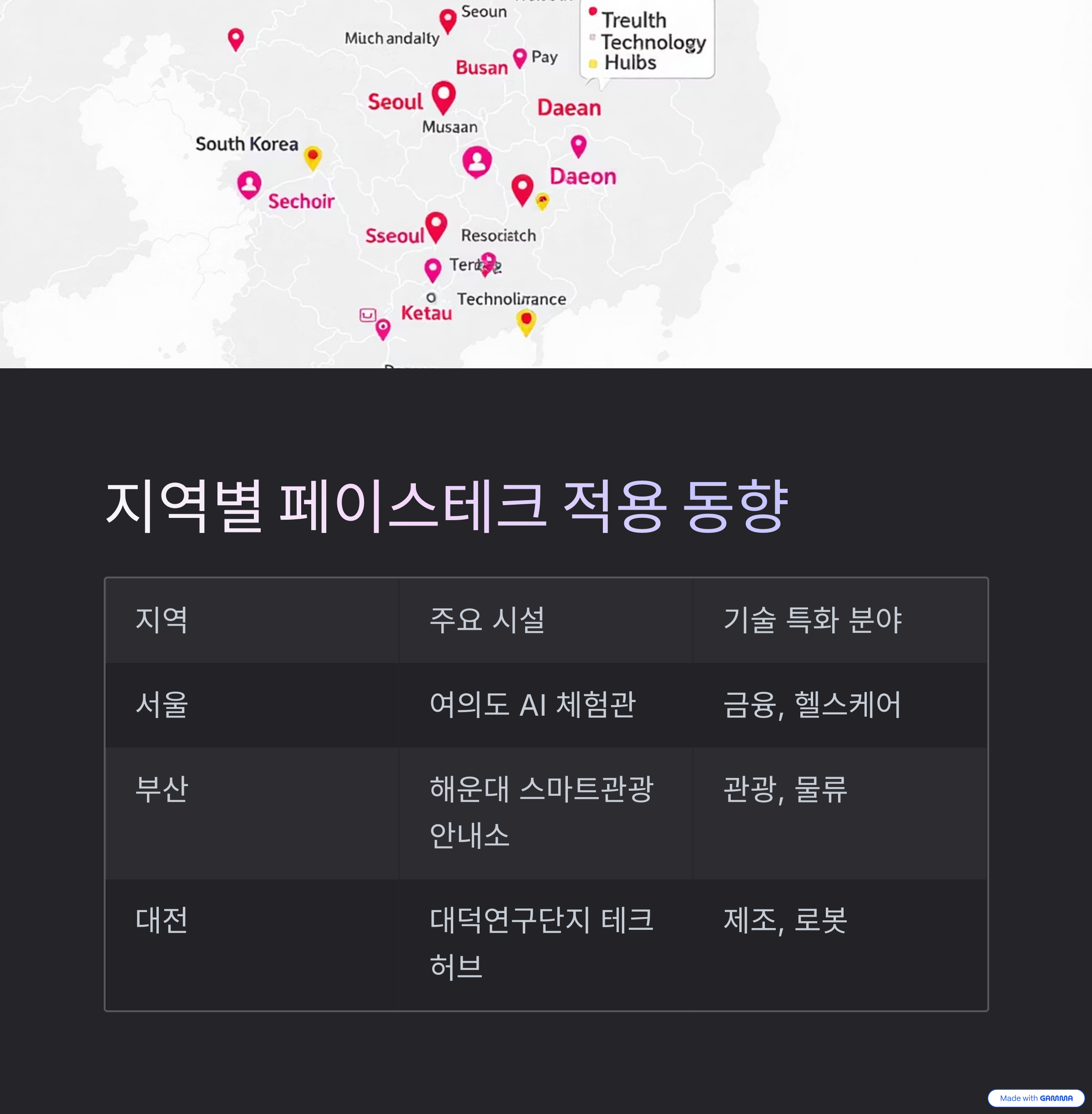 페이스테크 기술은 수도권뿐만 아니라 전국적으로 특화된 분야를 중심으로 활발하게 연구 및 적용되고 있습니다. 주요 지역별 특징은 다음과 같습니다.