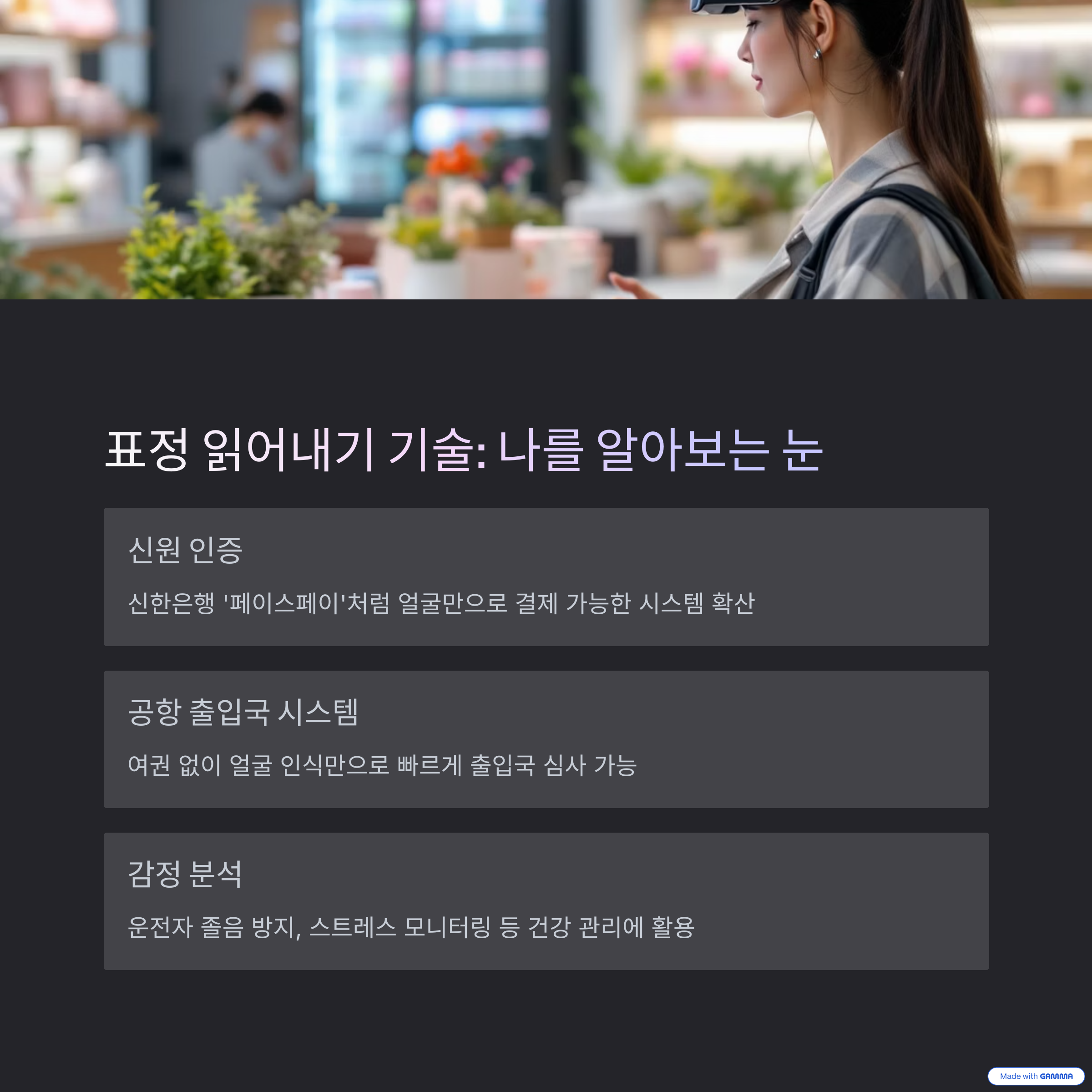 표정 읽어내기 기술은 단순히 신원을 확인하는 것을 넘어, 사람의 감정 상태나 컨디션까지 파악하는 수준으로 발전하고 있습니다.
