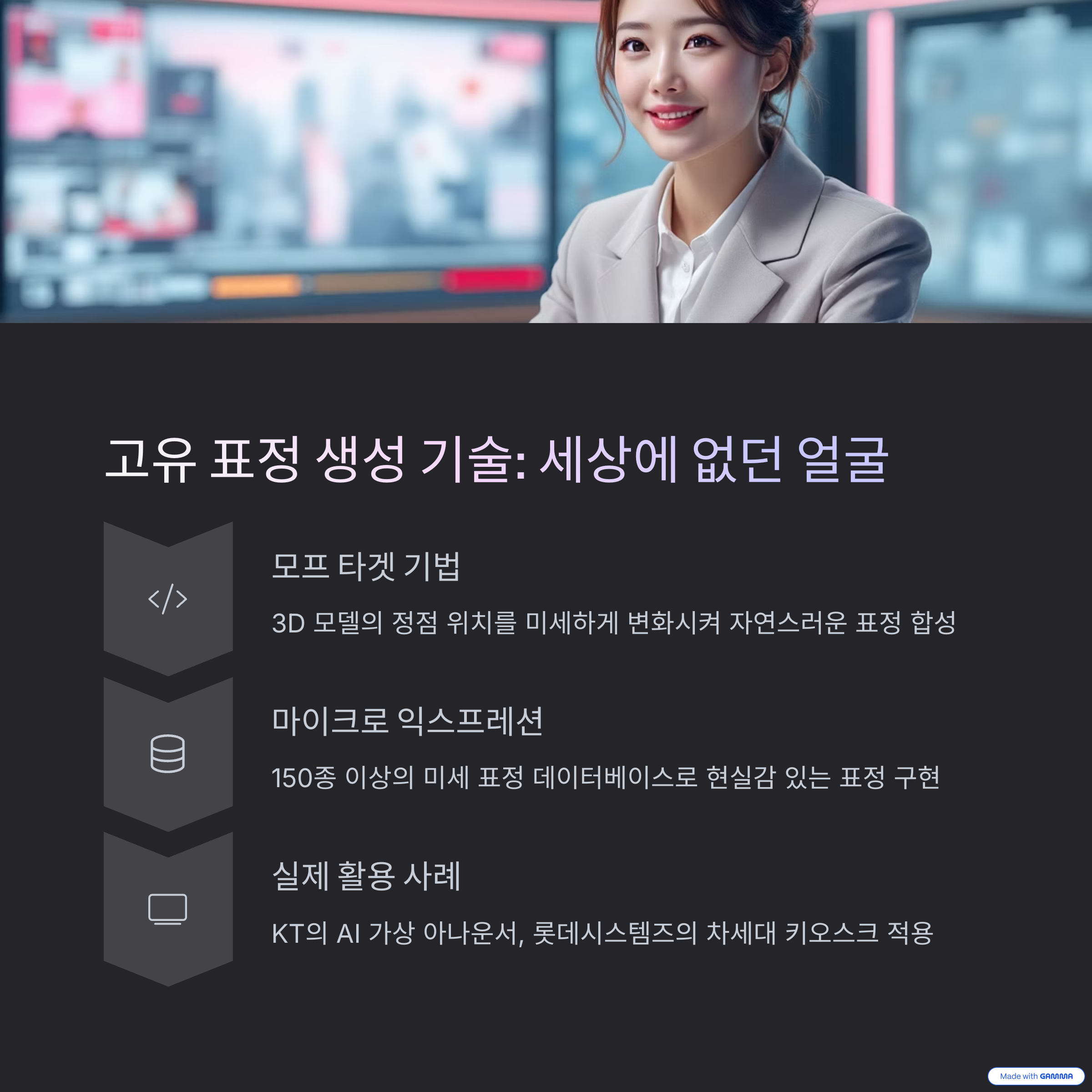 이 기술을 구현하기 위해서는 몇 가지 핵심 요소가 필요합니다. 대표적인 것이 '모프 타겟(Morph Target)' 기법입니다. 3D 모델의 정점(Vertex) 위치를 미세하게 변화시켜 웃거나 찡그리는 등 자연스러운 표정 변화를 합성해내는 기술이죠. 또한, 매우 짧은 순간 나타나는 미세한 표정 변화, 즉 '마이크로 익스프레션(Micro-expression)' 데이터베이스(최소 150종 이상)를 구축하고 AI에게 학습시켜 보다 현실감 넘치는 표정 생성을 가능하게 합니다.
