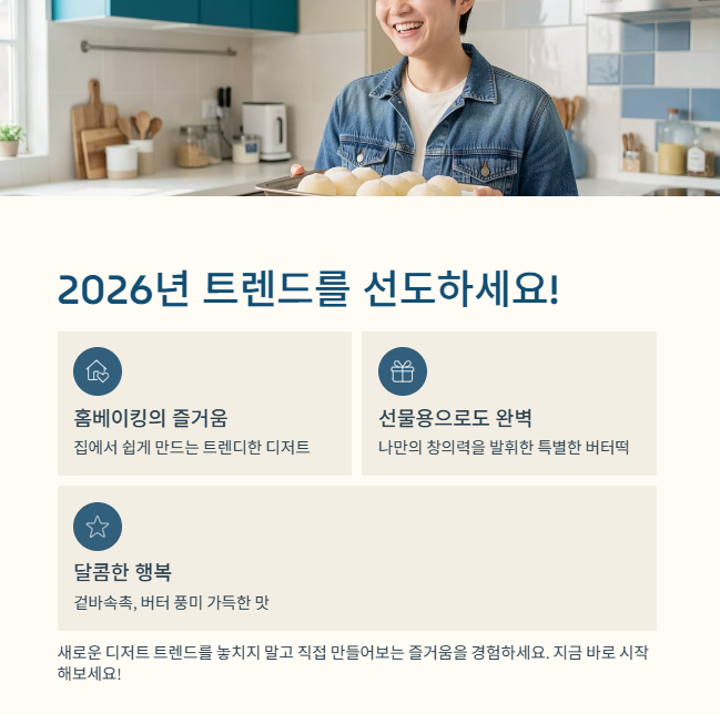2026년 디저트 시장을 뜨겁게 달굴 '넥스트 두쫀쿠'로 주목받는 버터떡, 이제 집에서 누구나 쉽게 만들어 즐길 수 있다는 사실에 놀라셨나요? 오늘 소개해 드린 간단한 레시피와 앙버터떡을 비롯한 다양한 응용 레시피들을 통해 여러분의 홈베이킹 실력을 한층 업그레이드해보세요. 겉은 바삭하고 속은 촉촉한, 버터 풍미 가득한 버터떡은 여러분의 일상에 달콤한 행복을 선사할 것입니다.
