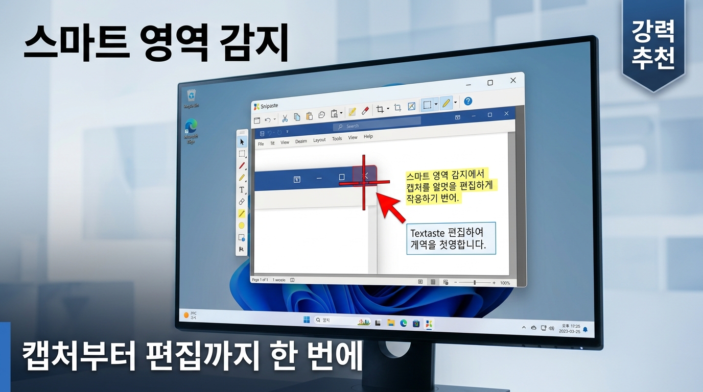 또한, 마우스 커서를 가져다 대면 창이나 버튼 등 UI 요소를 자동으로 인식하는 스마트 감지 기능을 통해 정밀한 영역 지정이 가능합니다. 캡처 즉시 화살표, 도형, 텍스트 삽입, 형광펜, 모자이크 처리 등 다양한 주석 도구를 활용할 수 있다는 점도 큰 장점입니다.