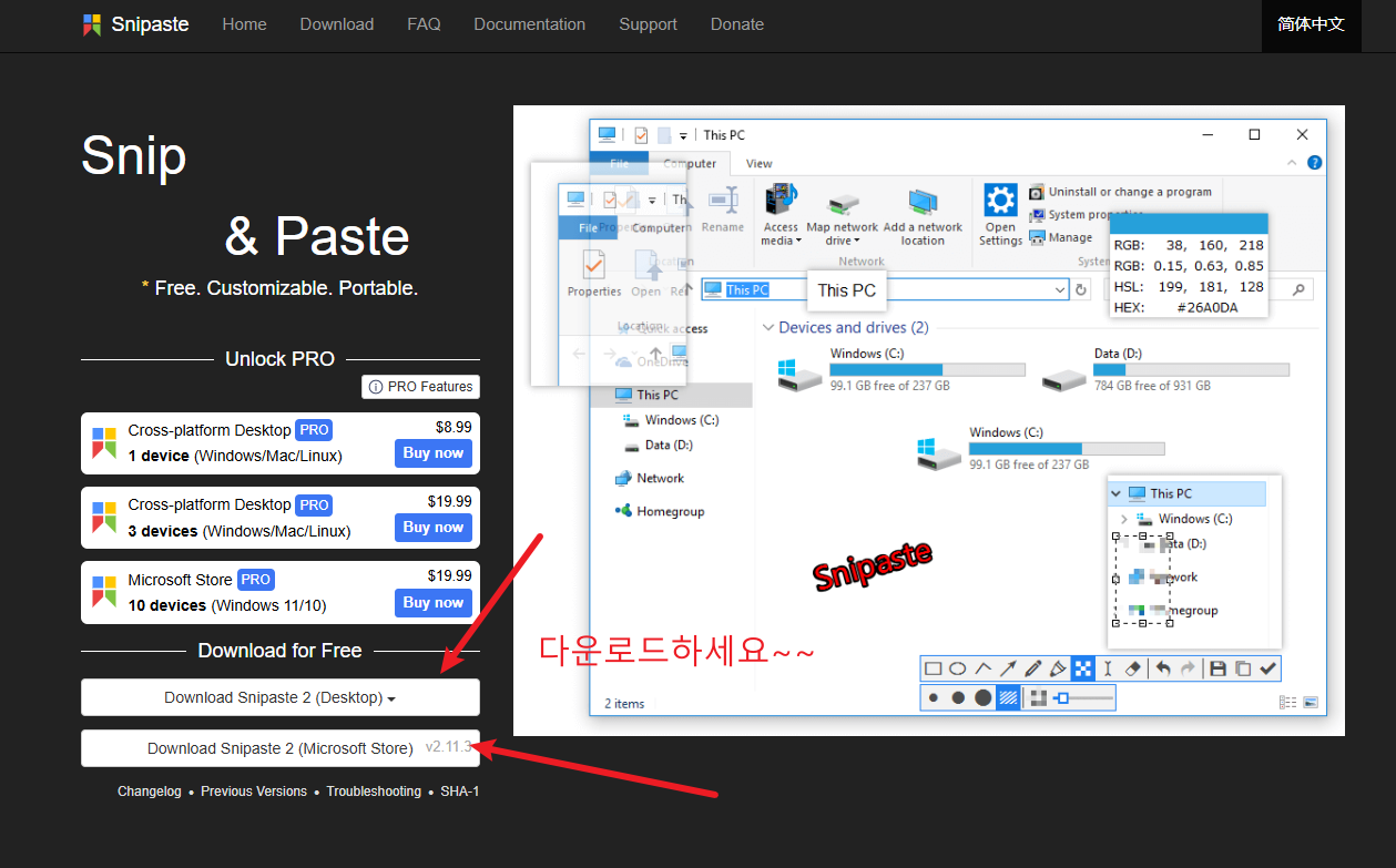 - 공식 홈페이지 접속: snipaste.com 에 접속하여 운영체제에 맞는 버전을 다운로드합니다.